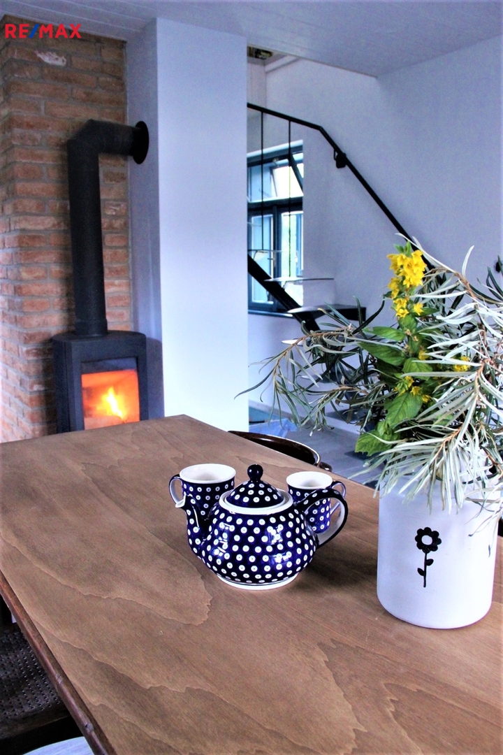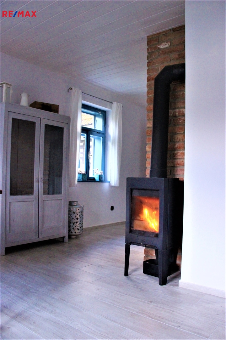 Topení: krbová kamna + podlahové topení (přízemí), el. přímotopy (patro)