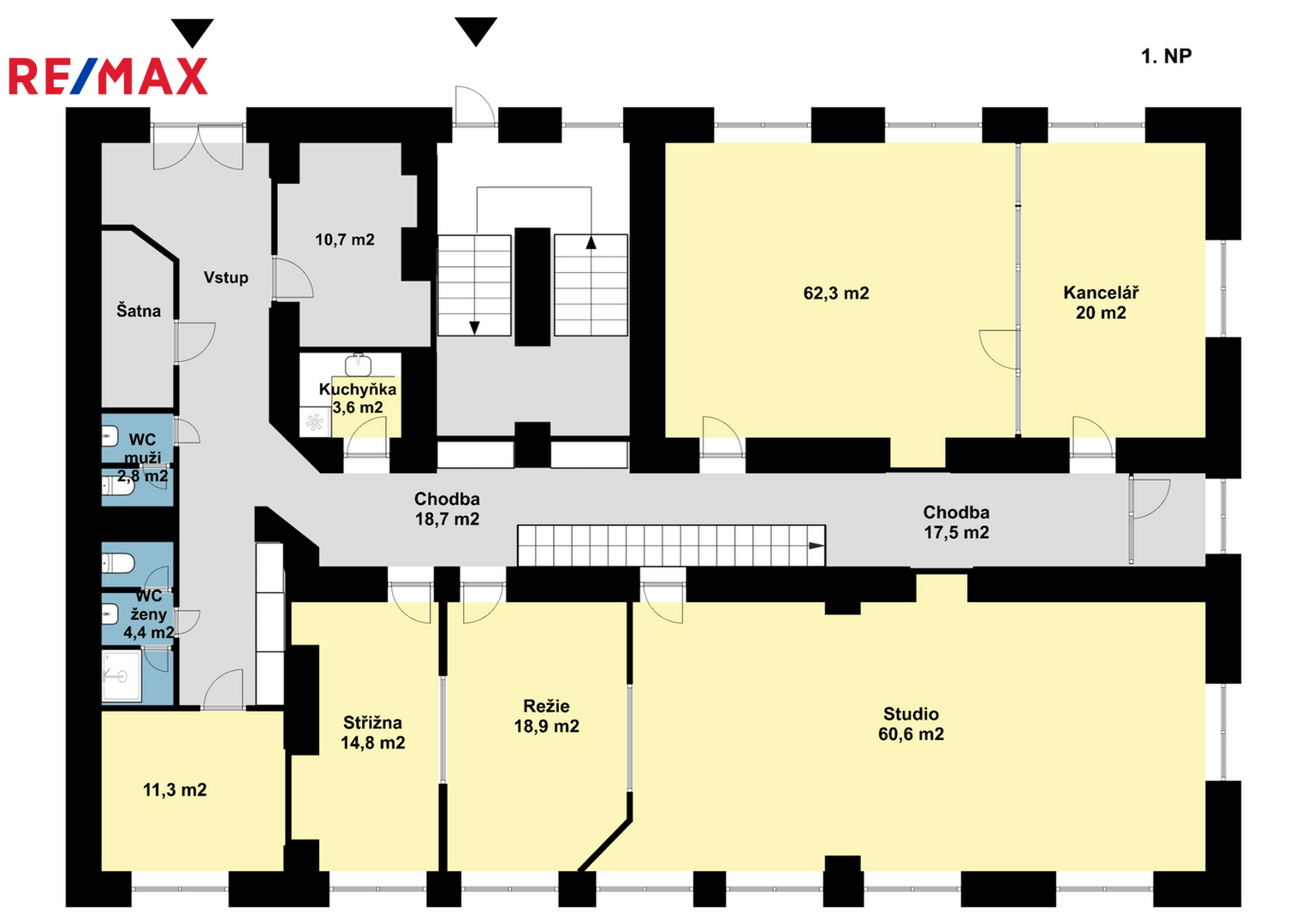 Dispozice spodního patra: 6 samostatných kanceláří (5 kanceláří a jednací místnost), sociální zázemí (2x WC) kuchyňka, šatna, sklad.