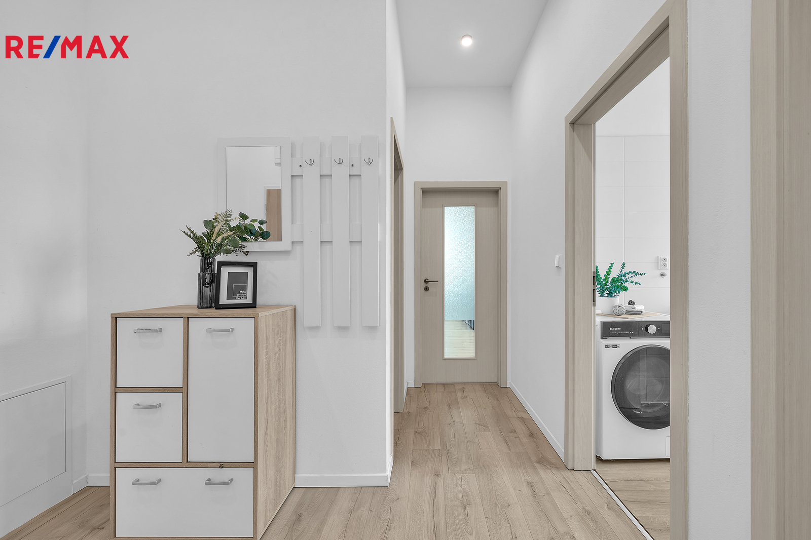 Byt působí vzdušně, čistě a moderně.