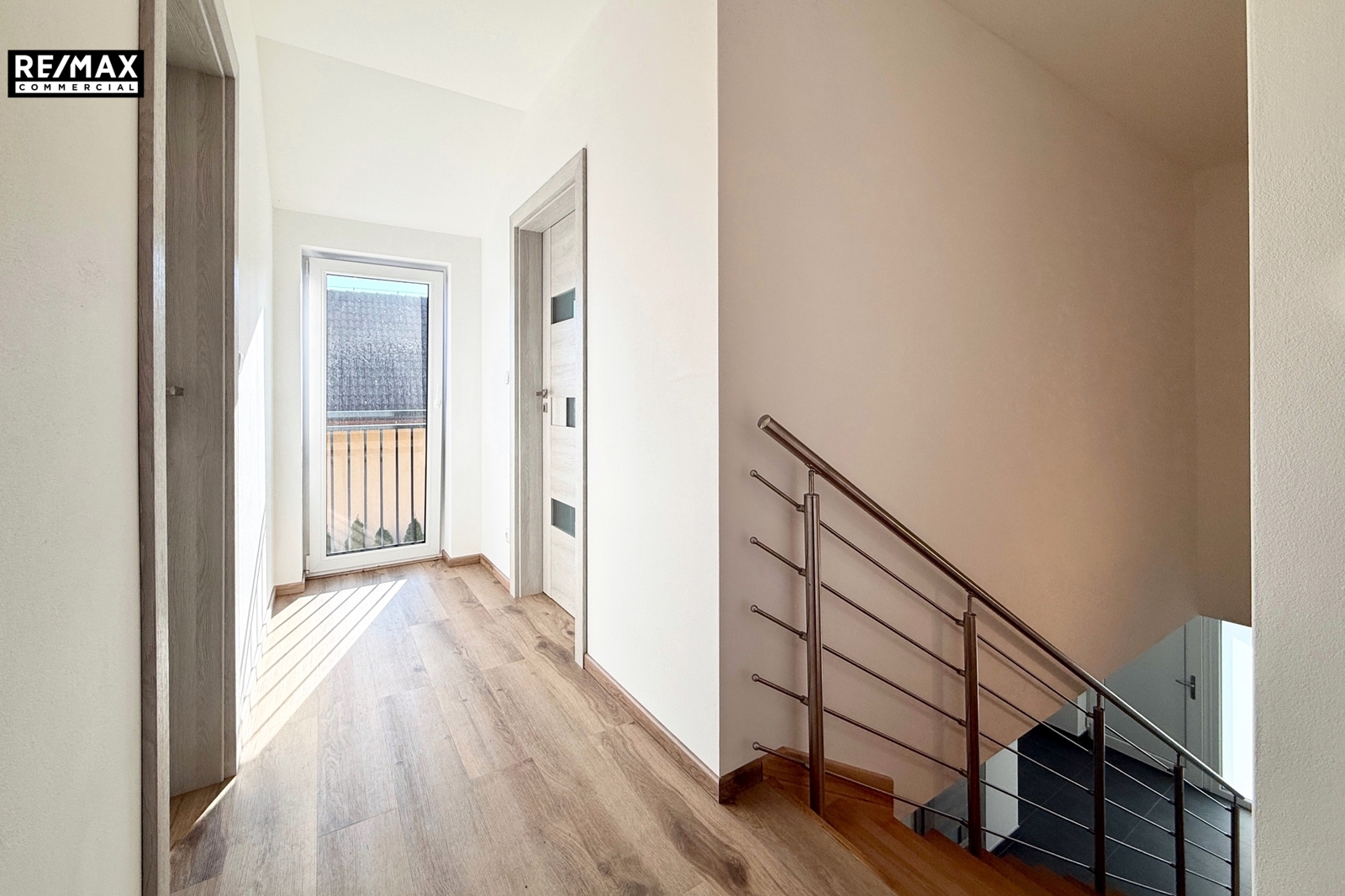 V patře jsou dva pokoje, velkorysá ložnice a koupelna s vanou, sprchovým koutem a WC. Dále pak šatna, která propojuje chodbu s koupelnou.