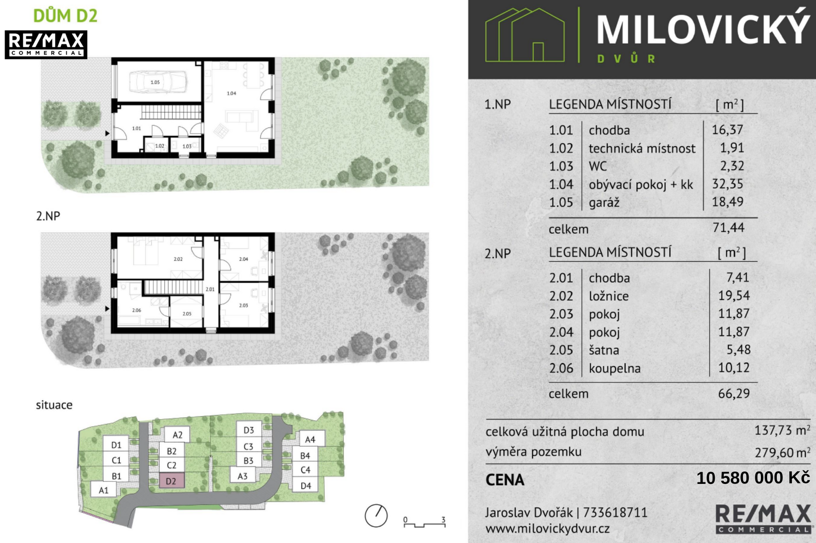 Moderní novostavba rodinného domu o dispozici 4+kk a užitné ploše 138 m², umístěná na pozemku o velikosti 280 m², je součástí projektu Milovický dvůr. Soubor 16 rodinných domů tvoří areál obklopený stávající zástavbou a zahradami ve staré čtvrti Milovic. Dům je dokončený, zkolaudovaný a připravený k nastěhování.