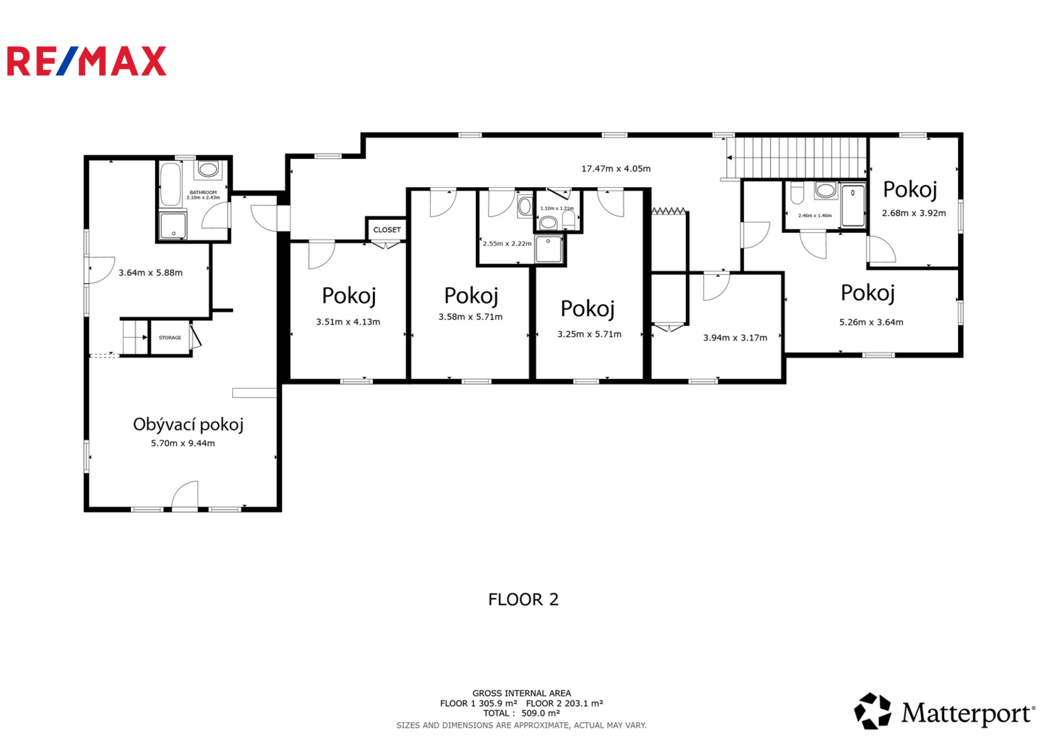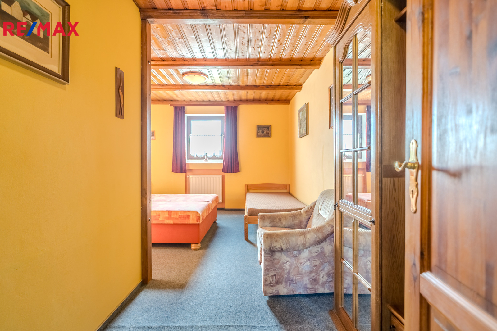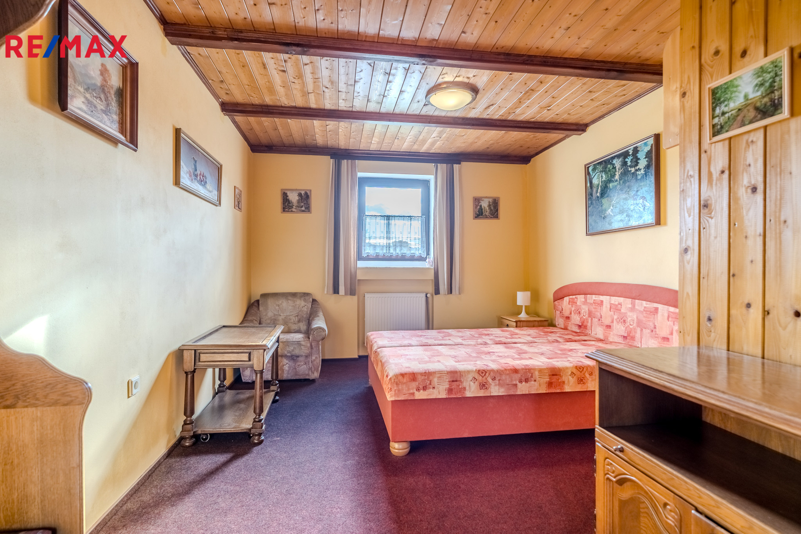 V druhém nadzemním podlaží se nachází pět apartmánů s celkovou kapacitou třinácti lůžek, koupelna a samostatná toaleta na patře je samozřejmostí, a také byt majitelů o dispozici 4+1 s balkonem. Z bytu se dá vystoupat do podkroví, kde se nacházejí další tři samostatné pokoje, vhodné jako ložnice, dětské pokoje nebo pracovny. Součástí domu je garáž, a další možnost parkovacích míst se nabízí na pozemku.