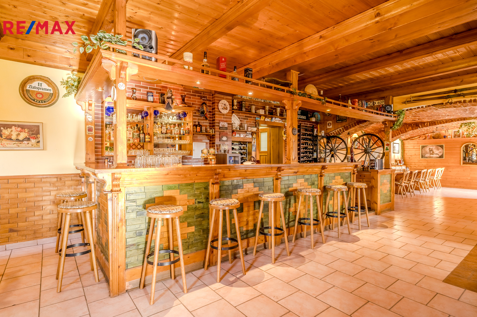 V prvním nadzemním podlaží se nachází plně vybavená kuchyně uzpůsobená pro větší objem vaření, ideální například pro oslavy nebo jiné společenské akce. Dále je zde prostorná společenská místnost s televizí a krbem, útulný prostor s posezením pro zhruba 30 osob, dvě toalety, šatna, kotelna a technická místnost. Z hlavního vstupu lze vyjít na rozlehlou terasu, která přímo vybízí k letnímu posezení s rodinou či přáteli.