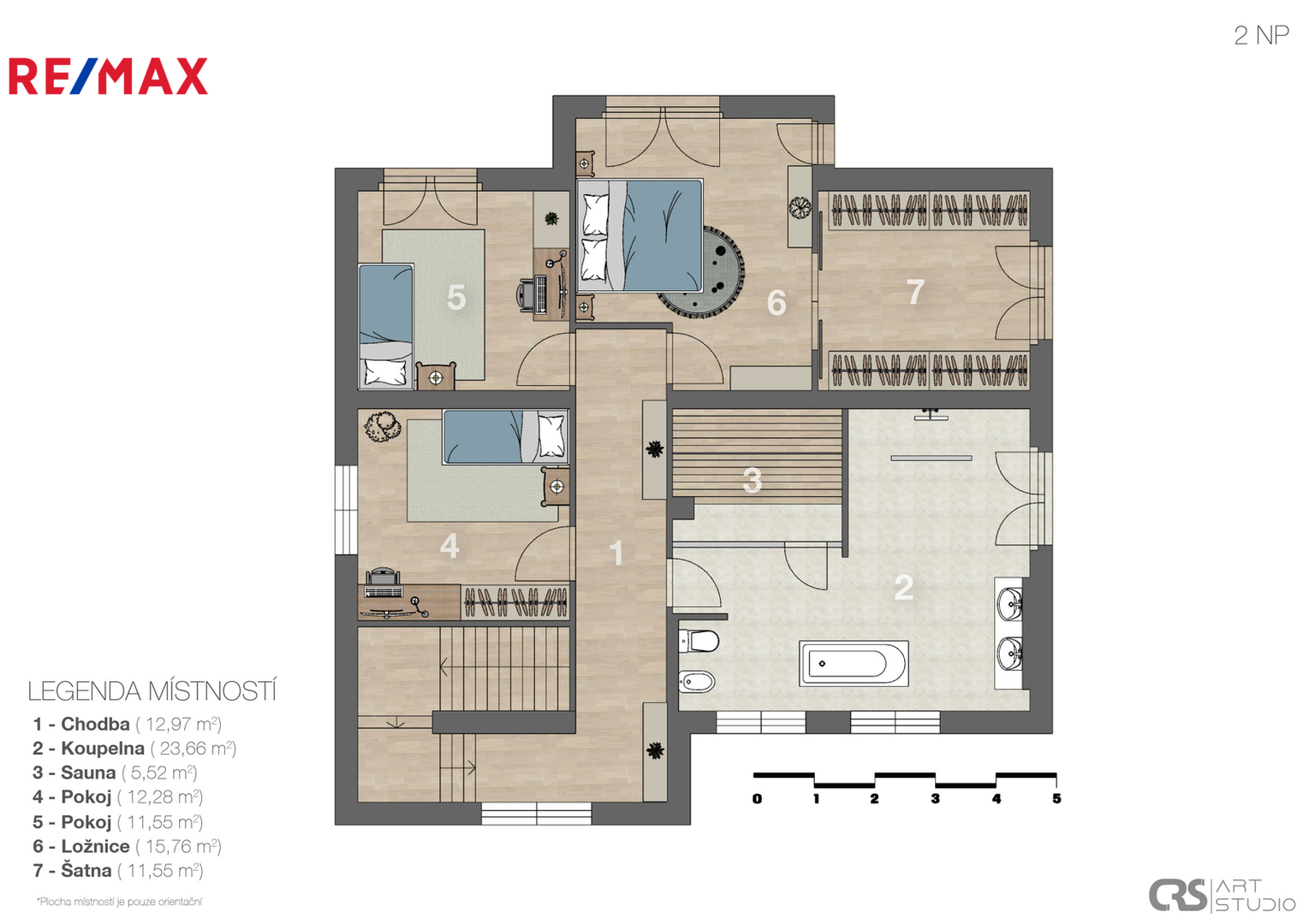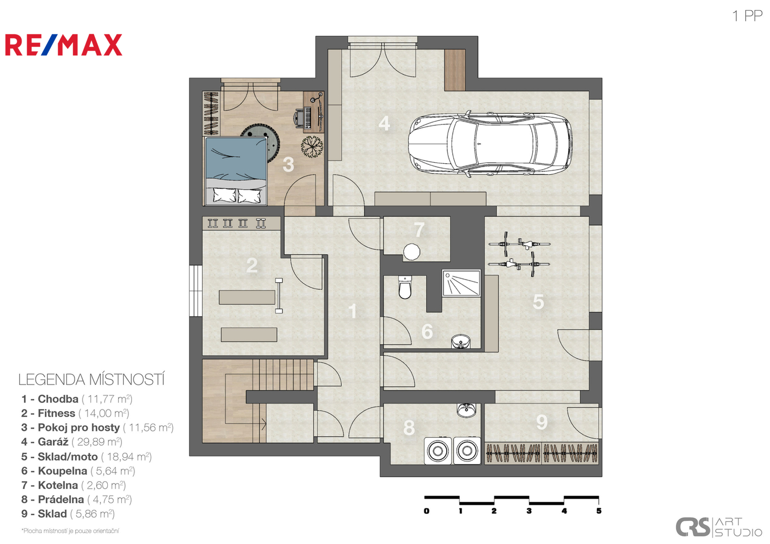V 1. podlaží máte pokoj pro hosty, fitness, koupelnu se sprchovým koutem a toaletou a technické místnosti. Dominantou domu je 2. podlaží, kde najdete obývací pokoj, který elegantně navazuje na kuchyni a jídelnu, což vytváří příjemný a vzdušný prostor pro každodenní život i setkávání s rodinou či přáteli. Kuchyňská linka je plně vybavena veškerými spotřebiči a svým stylem hezky ladí s ostatními místnostmi. Dále je zde pracovna, zabudovaná šatna, spíž a nechybí další koupelna se sprchovým koutem a toaletou. Ve 3. podlaží je ložnice s přilehlou šatnou, 2 dětské pokoje a velmi prostorná koupelna vybavena volně stojící vanou, sprchovým koutem, toaletou, bidetem a saunou. Ve sklepě pak máte regály pro uskladnění potravin a nápojů a studnu.