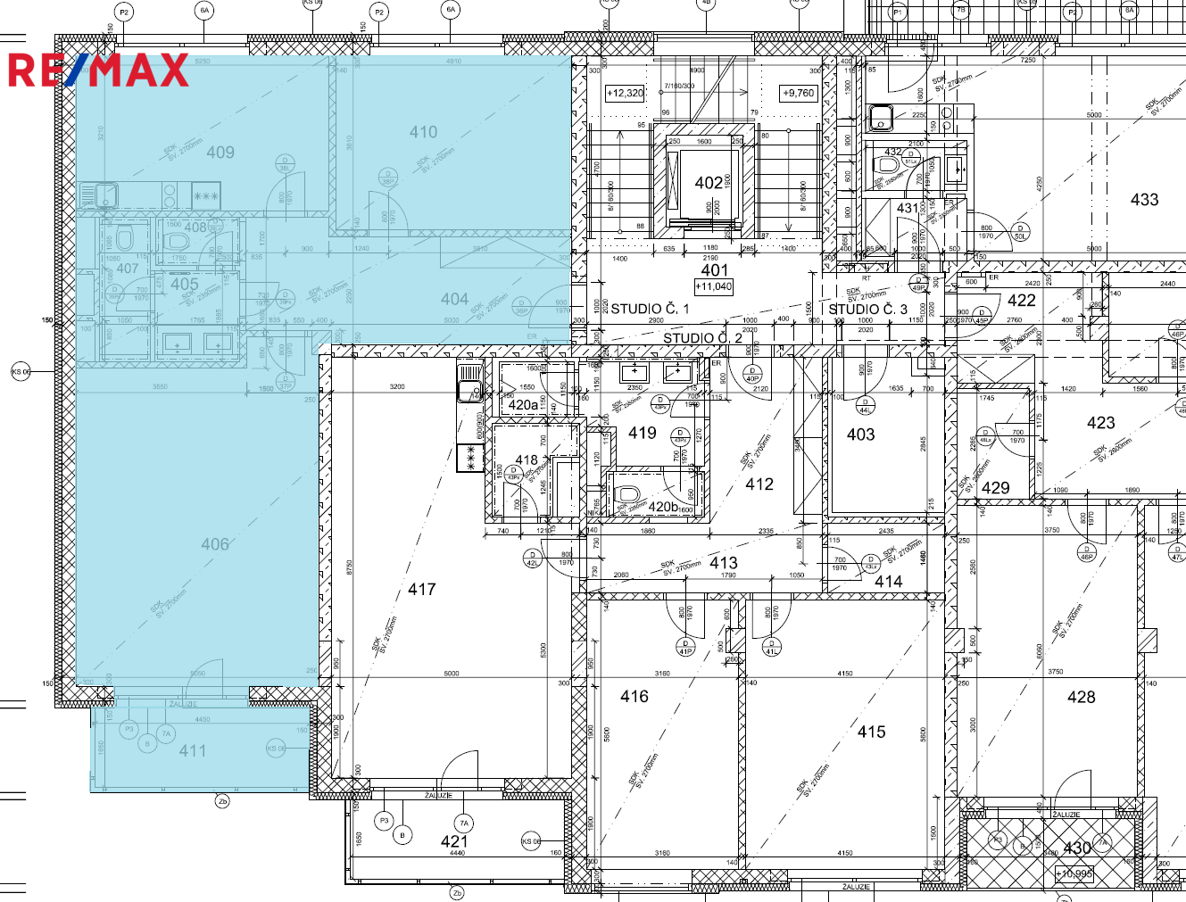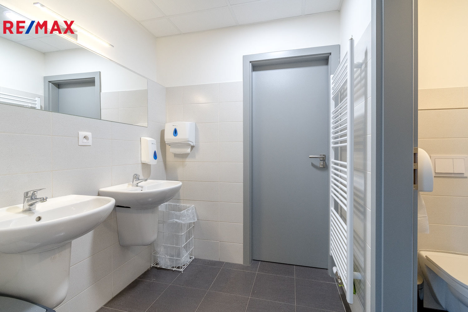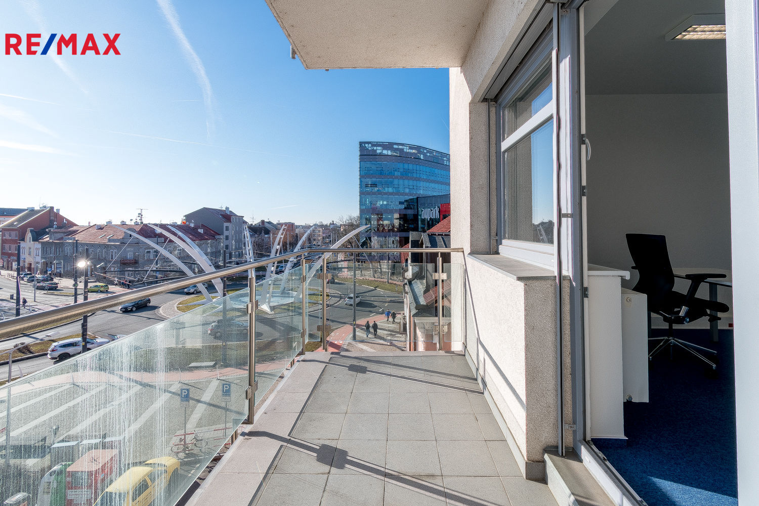Dispozici prostor tvoří 2 samostatné kanceláře, samostatná místnost s kuchyňskou linkou (není na fotografiích), odpovídající sociální zázemí (wc, umývárna, wc + sprchový kout) a balkón s výhledem na dopravní stavbu roku - křižovatku U Koruny.
