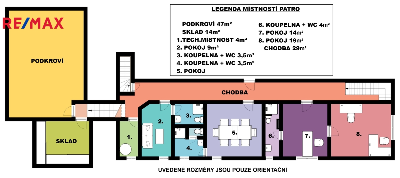 • Obytná/Kancelářská část: 11 obytných místností ve dvou nadzemních podlažích. Některé místnosti jsou před dokončením s možností úprav. Místnosti jsou flexibilní a lze je využít jako kanceláře, byty, sklady či dílny. Součástí pozemku je i Stodola před dokončením interiérů, perfektní jako sklady, dílna, garáže nebo zázemí pro firmu.