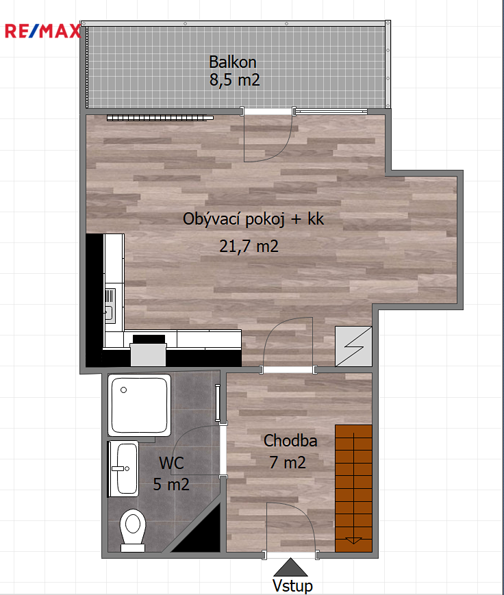První patro: světlý obývací pokoj s balkonem a kuchyňským koutem, vstupní chodba se schodištěm, koupelna se sprchovým koutem a WC.
