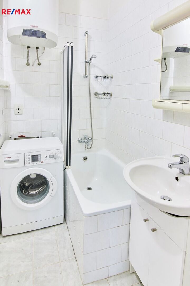 V koupelně je menší vana (120 cm) se zástěnou umožňující pohodlné sprchování. Dále je zde zavěšen elektrický bojler na ohřev užitkové vody (100 Ltr.). Předsíň disponuje úložným prostorem nade dveřmi a vestavěnou šatní skříní. Také je zde samostatná spíž s prostorným regálem. K bytu lze využít též sklepní prostor velikosti 4 m2 se závěsnými háky na 2 jízdní kola.
