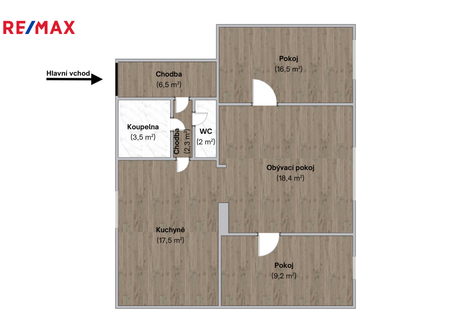 Dispozici tvoří vstupní hala o velikosti 6,5 m² a navazující chodba o výměře 2,3 m². Centrální částí bytu je pokoj s kuchyňským koutem o velikosti 17,5 m² a samostatný obývací pokoj s krbovými kamny o výměře 18,4 m². K dispozici jsou také dva další pokoje – jeden o 16,5 m² a druhý o 9,2 m². Koupelna má 3,5 m² a samostatné WC 2 m².