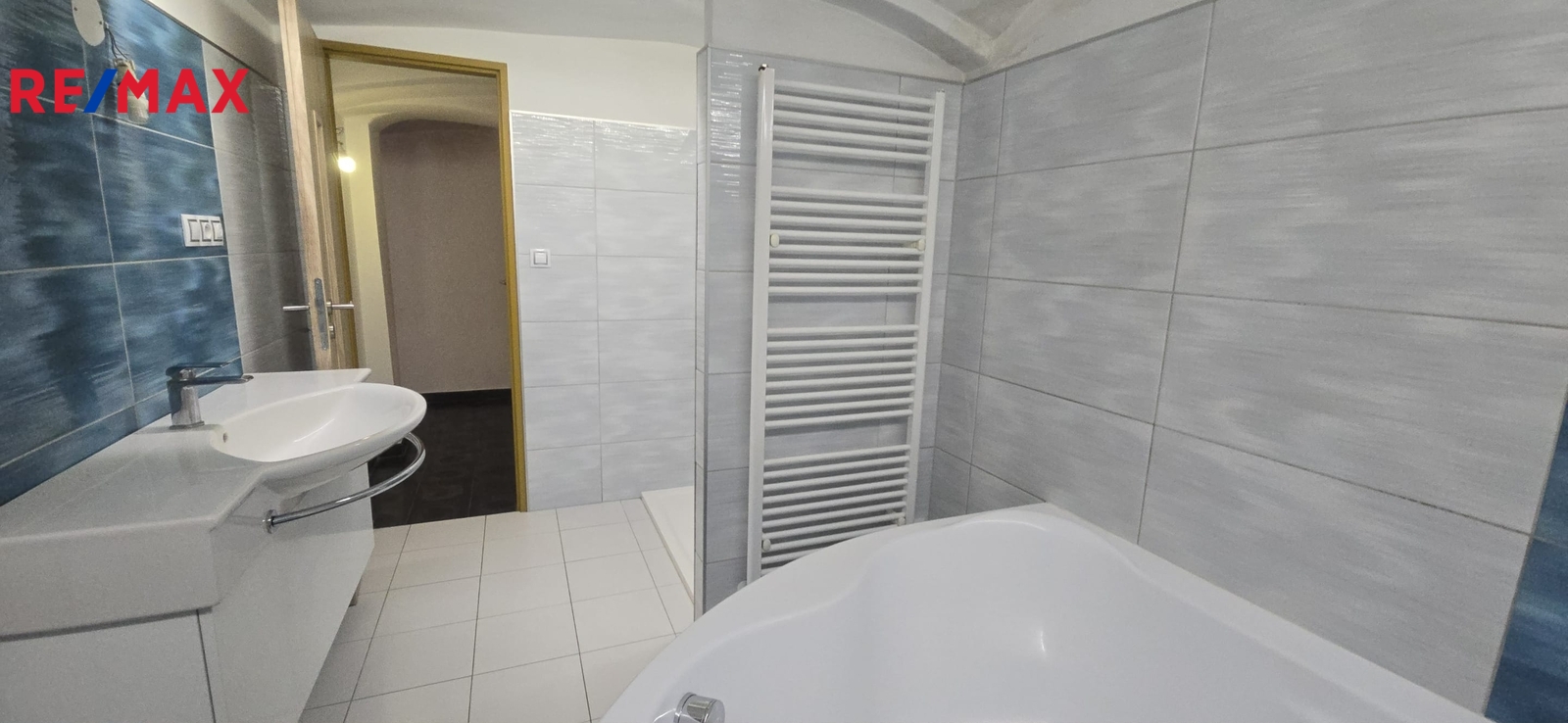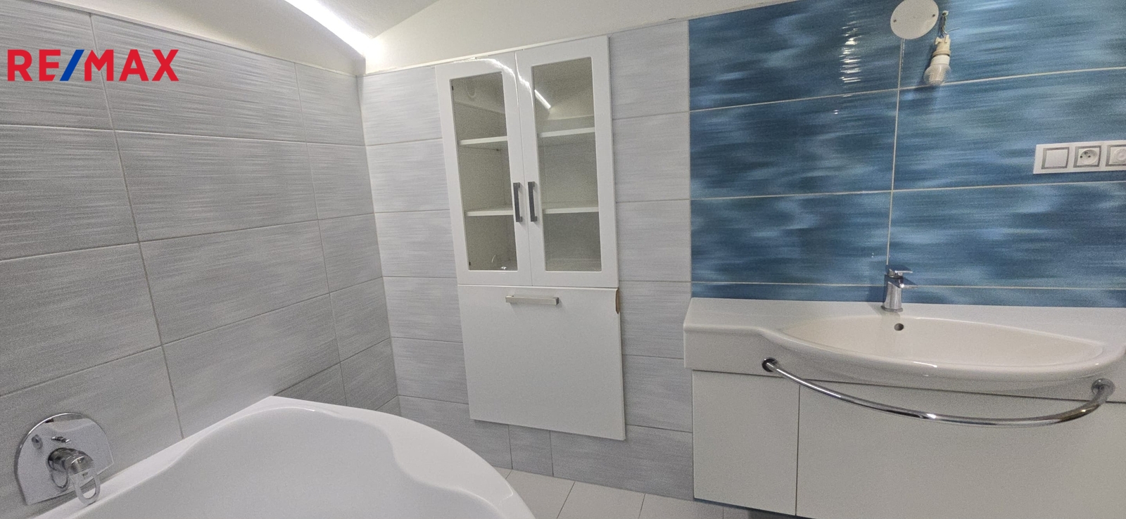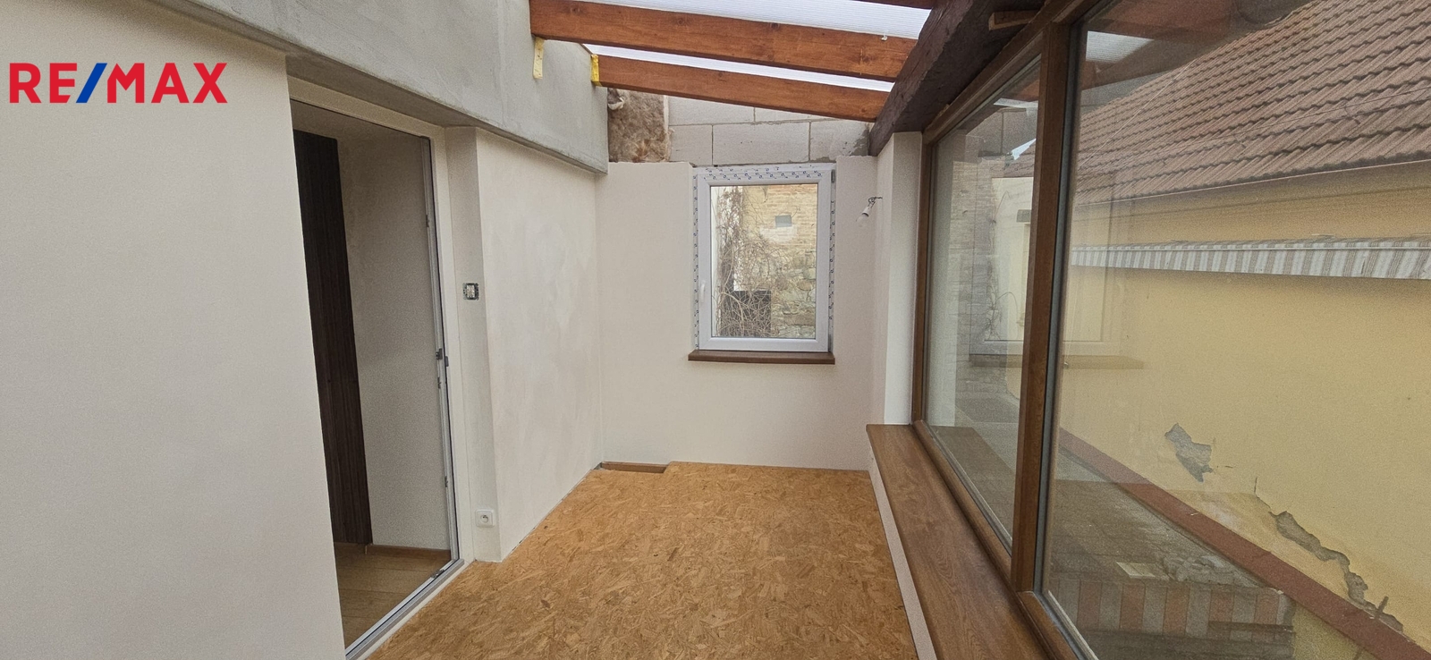 V patře tři samostatné pokoje a balkón/zimní zahrada s vytápěním. Dřevěné schodiště a podlahy v patře, krom jednoho pokoje, kde je koberec. Snížené stropy sádrokartonovým podhledem s osvětlením.