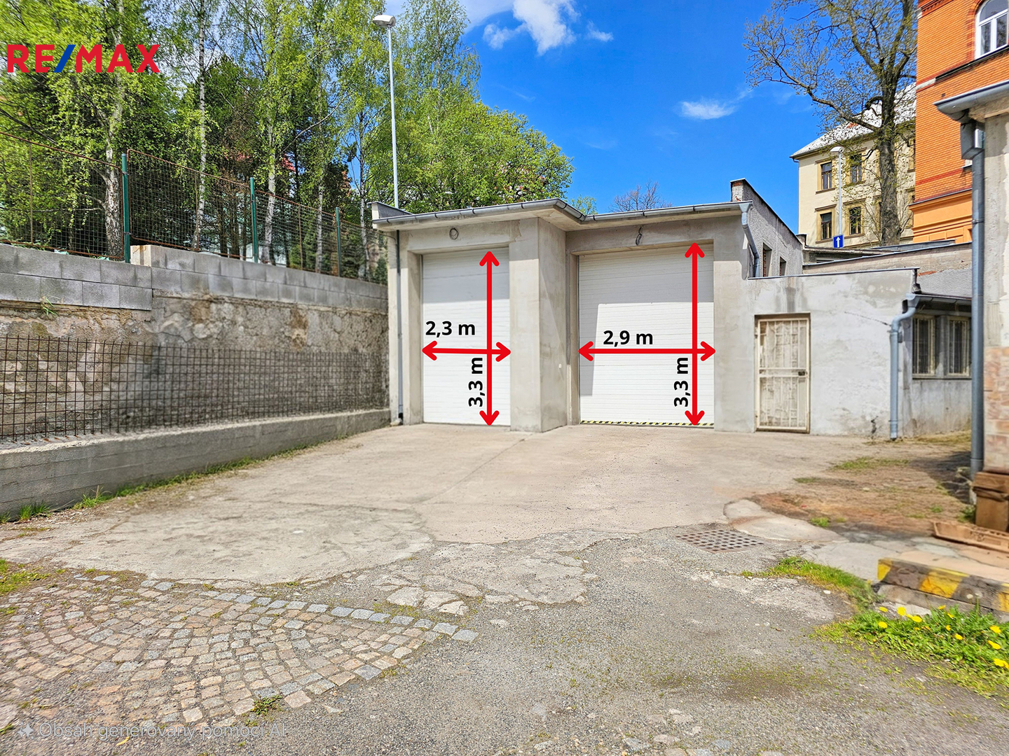 2) Garáž cca 56 m2 s dvěma samostatnými vjezdy (viz foto) , montážní jáma.