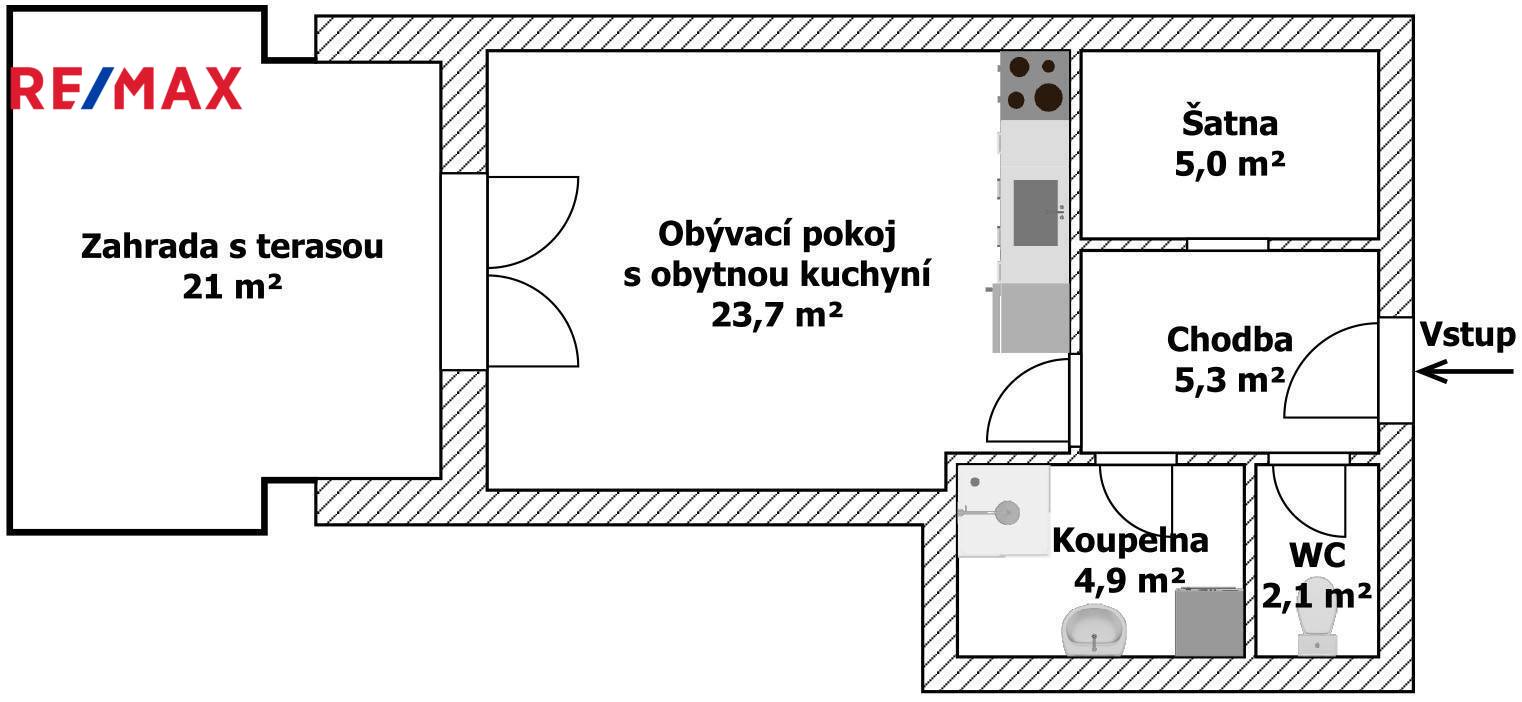 Velikosti místností: obývací pokoj s kuchyňským koutem 24 m2, předsíň 5 m2, šatna 5 m2, koupelna s se sprch. koutem 5 m2, samostatné WC 2 m2.