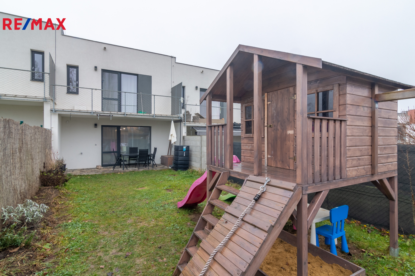 Velkou výhodou domu je orientace zahrady (127 m²) přímo do biokoridoru – zelené zóny s vegetací a herními prvky pro děti. Ze zahrady je přímý vstup do této přírodní oblasti, která nabízí maximální soukromí, klid a kontakt s přírodou. Ideální pro rodiny s dětmi, milovníky klidu i majitele psů.