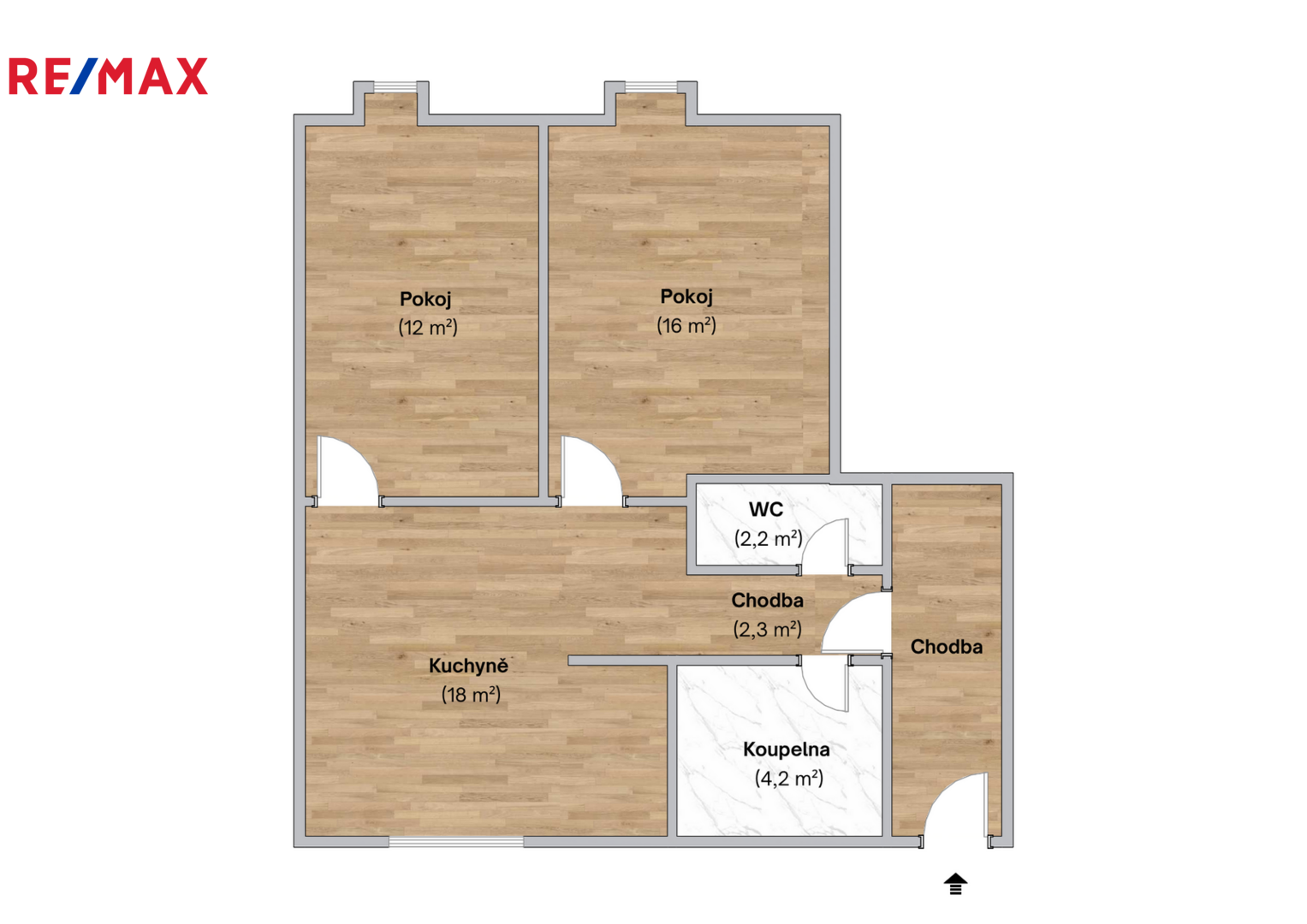 Dispozici bytu tvoří společná vstupní hala (6,5 m²), chodba (2,3 m²), obývací pokoj s kuchyňským koutem (18 m²), ložnice (16 m²), další pokoj (12 m²), koupelna (4,2 m²) a samostatné WC (2,2 m²). K bytu patří venkovní terasa s přilehlým travnatým prostorem, který lze využít k posezení, odpočinku nebo drobnému zahradničení. Přímo u domu jsou k dispozici dvě parkovací místa.