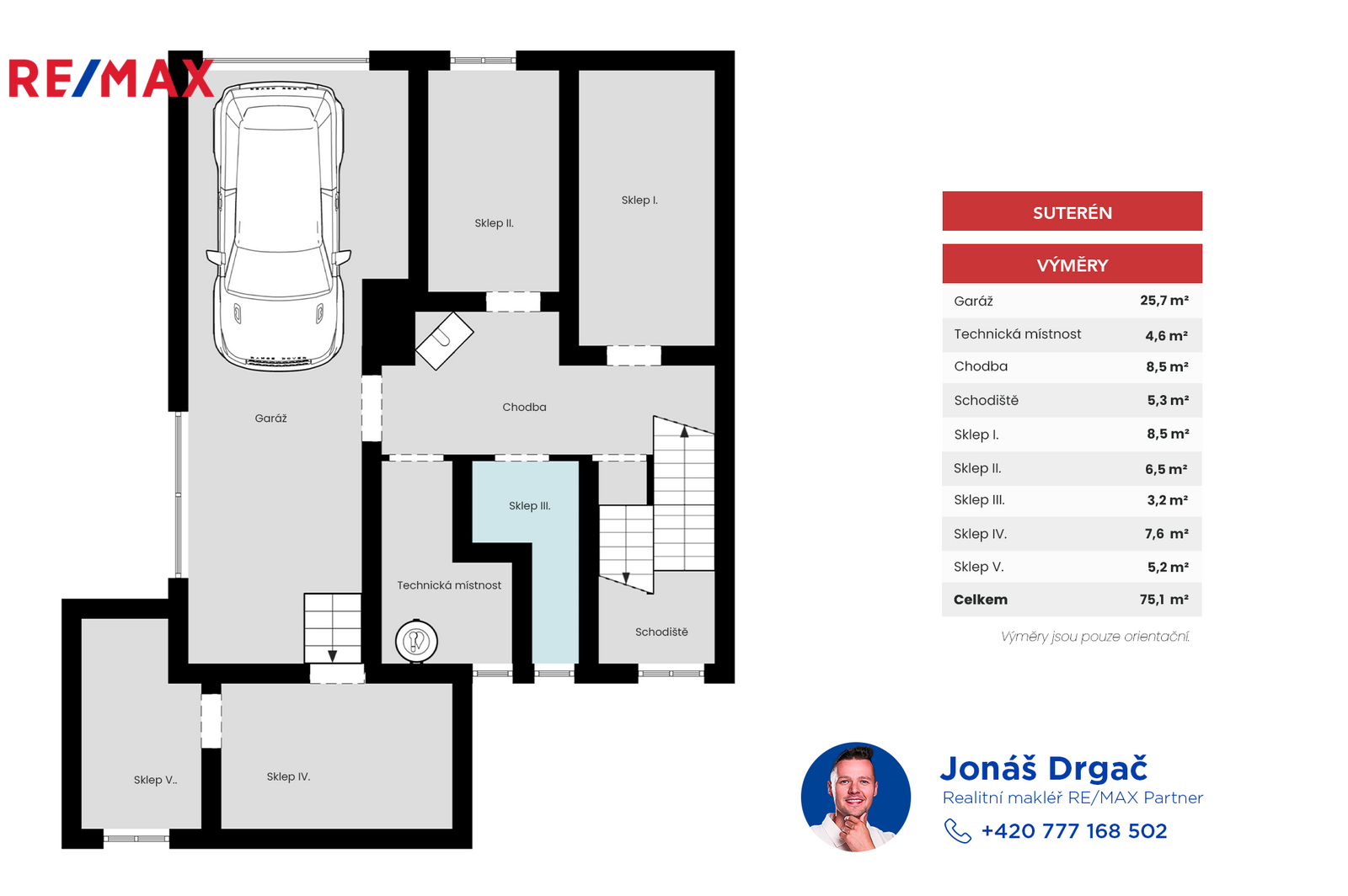 Suterén (celé podsklepené patro): velký sklep po celé ploše domu, garáž a technické zázemí.