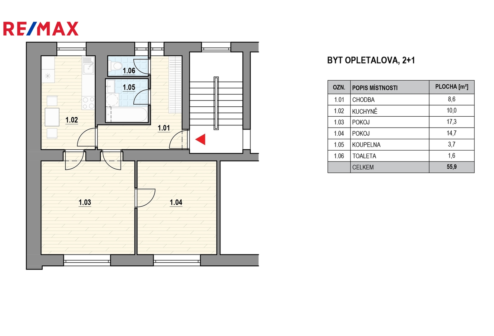 Podlahová plocha bytu je 56 m2, pokoje: 17 a 15 m2, kuchyň 10 m2. Byt je před rekonstrukcí, na podlaze v pokojích parkety, v kuchyni PVC, plastová okna se žaluziemi, 2 sklepy (4 m2). Orientace oken: 2 místnosti na východ, kuchyň na západ.