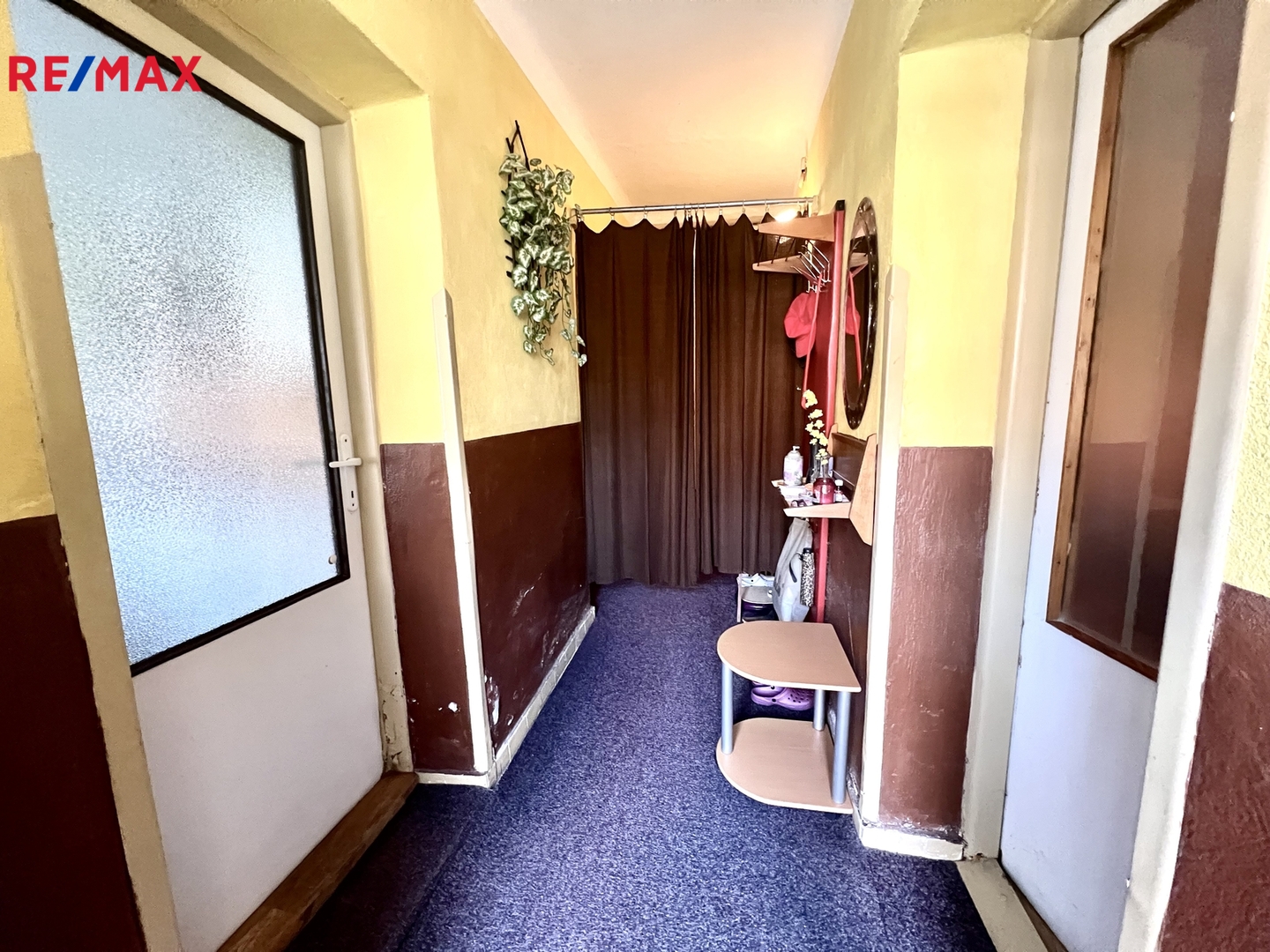 Dispozice: vstupní chodba, napravo 2 průchozí pokoje, nalevo kuchyně, pokoj a koupelna a toaleta, za koupelnou je komora přístupná z chodby.