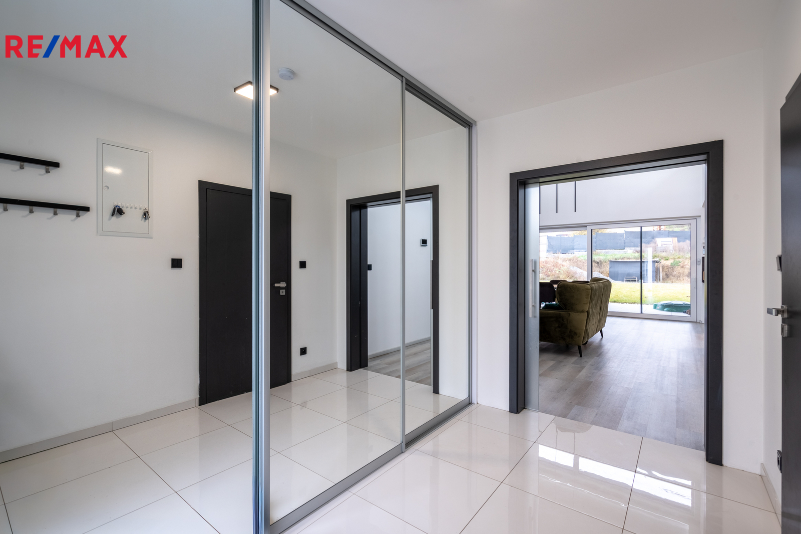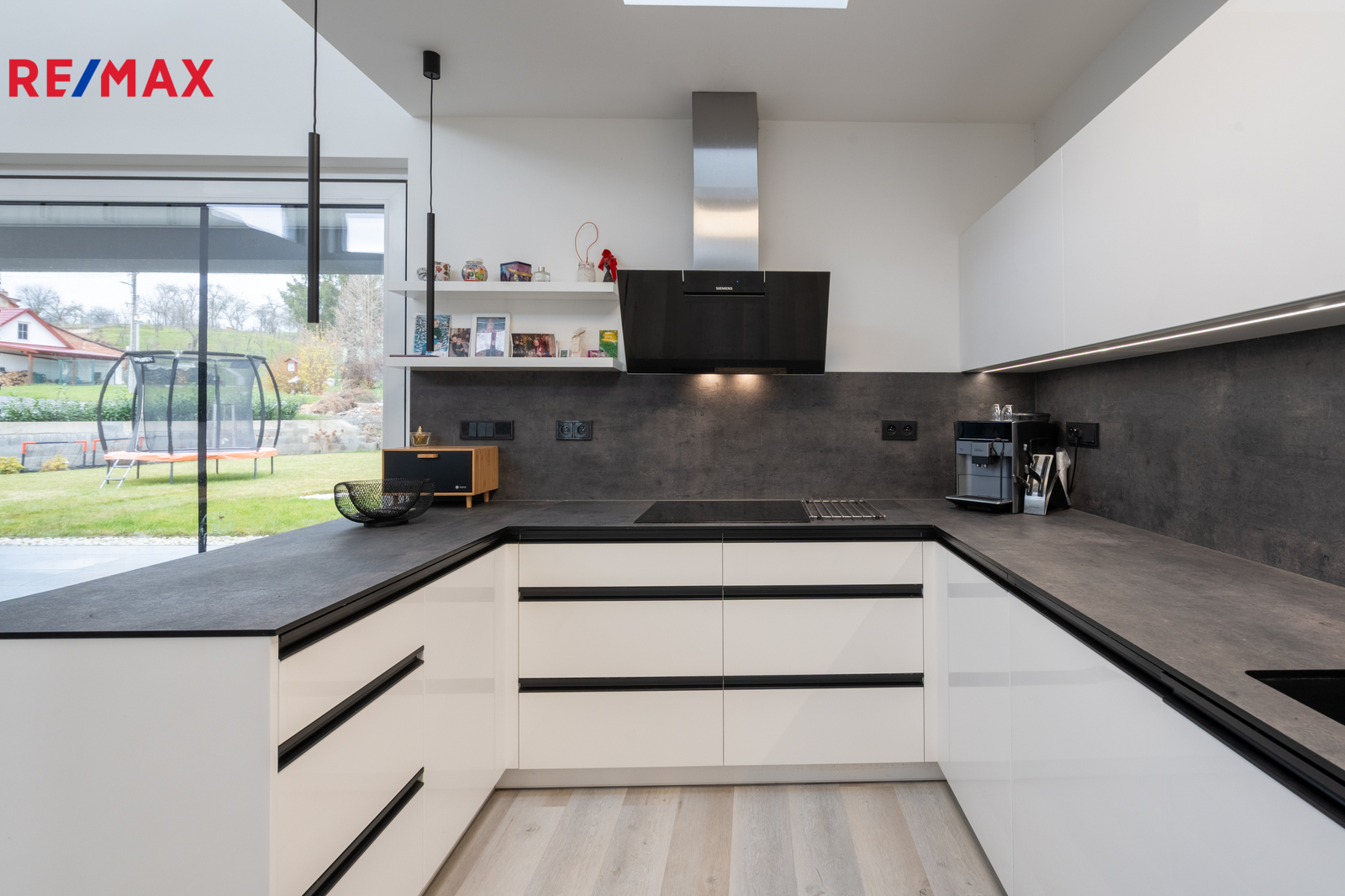 Dominantou domu je impozantní, vzdušný obývací pokoj s vysokými stropy, který vás okouzlí už při vstupu. Je dokonale propojený s designovou kuchyní na míru, vyrobenou kvalitním stolařem. Odtud máte přímý vstup na opravdu obrovskou terasu, ideální pro rodinné chvíle, grilování nebo ranní kávu s výhledem do zeleně. Terasa plynule navazuje na zahradu – perfektní místo pro děti, relax i soukromí.
