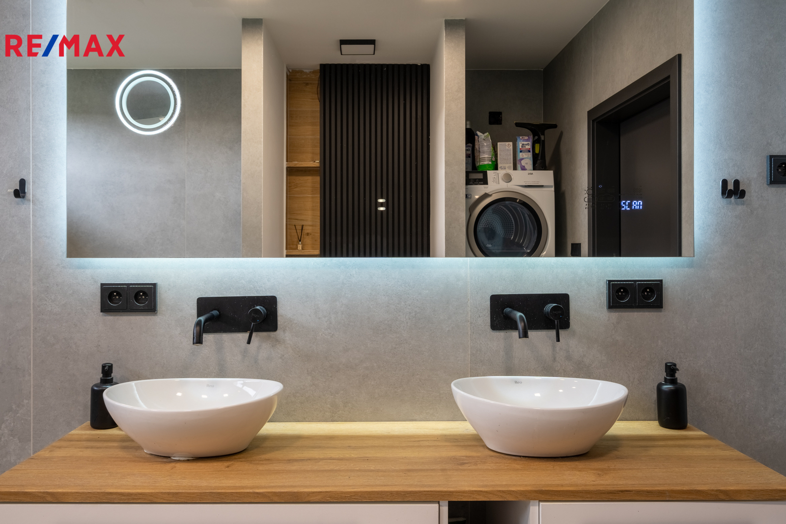 K domu dále náleží garáž pro dva automobily a samozřejmě perfektně řešené zázemí, které dotváří pocit luxusu a pohodlí.