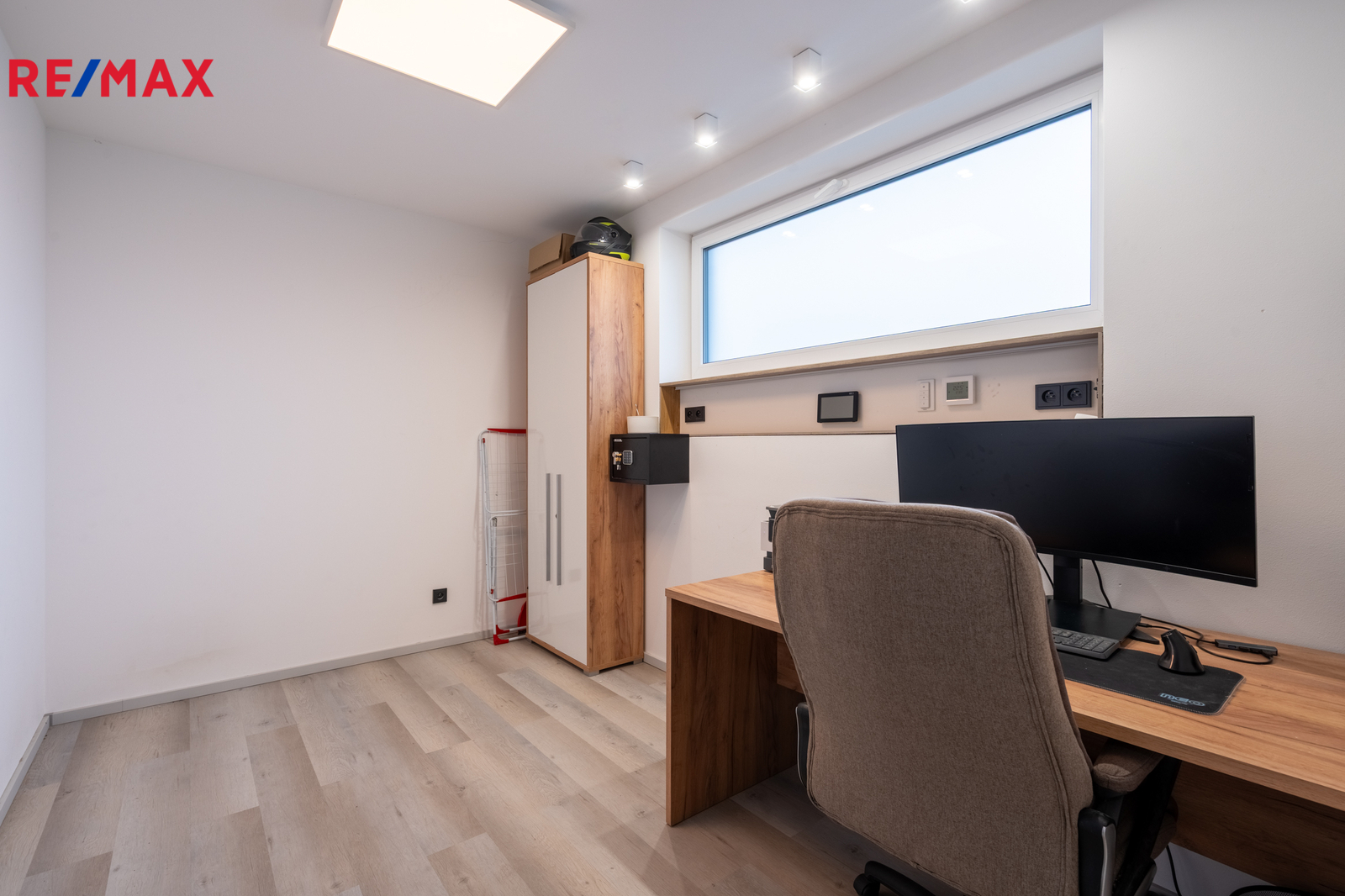 Dům nabízí 3 samostatné prostorné pokoje. Hlavní ložnice má navíc vlastní šatnu a soukromou luxusní koupelnu, což poskytuje naprostý komfort rodičům. Nechybí ani pracovna, kterou můžete snadno proměnit v dětský pokoj nebo pokoj pro hosty.