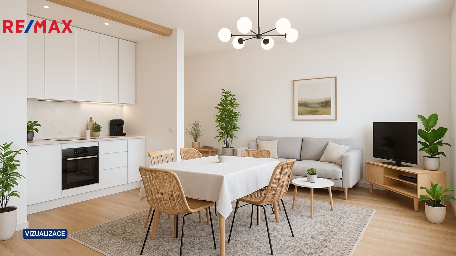 Prostorný obývací pokoj (27,5 m²), samostatná kuchyň (10,5 m²), jídelna (10,1 m²) a schodiště do 2. patra.