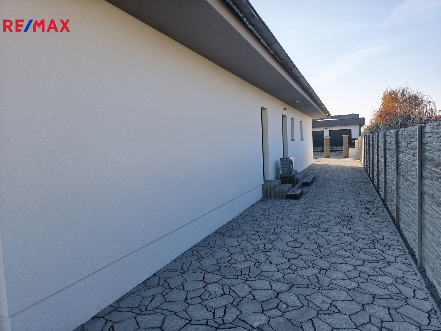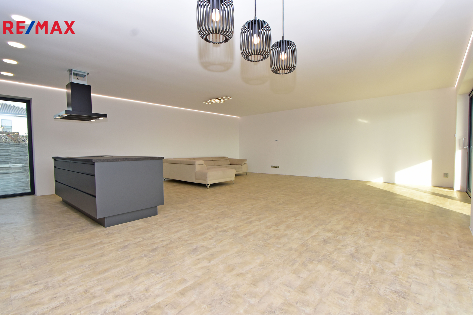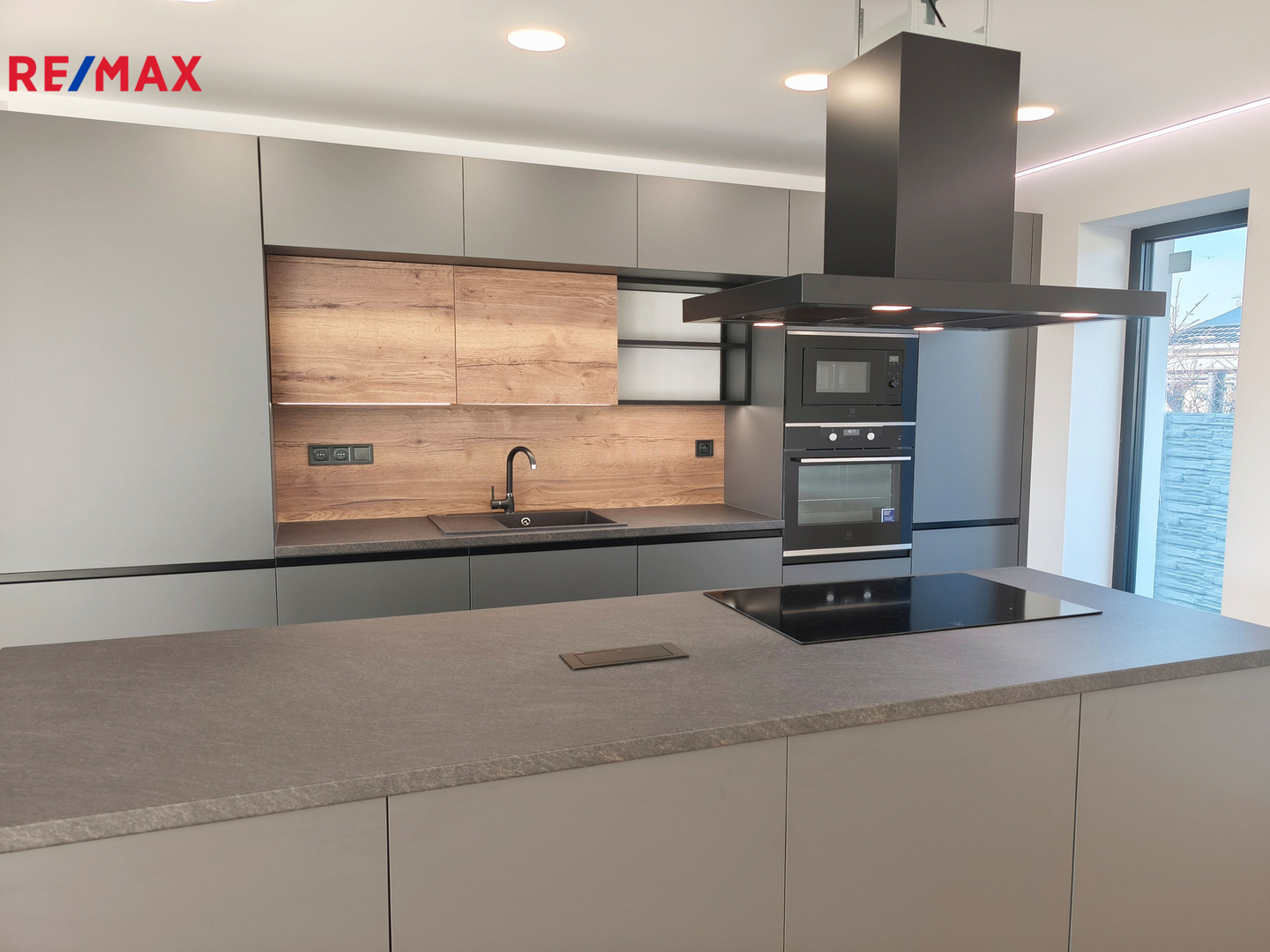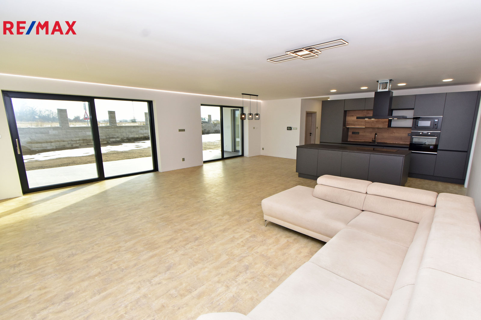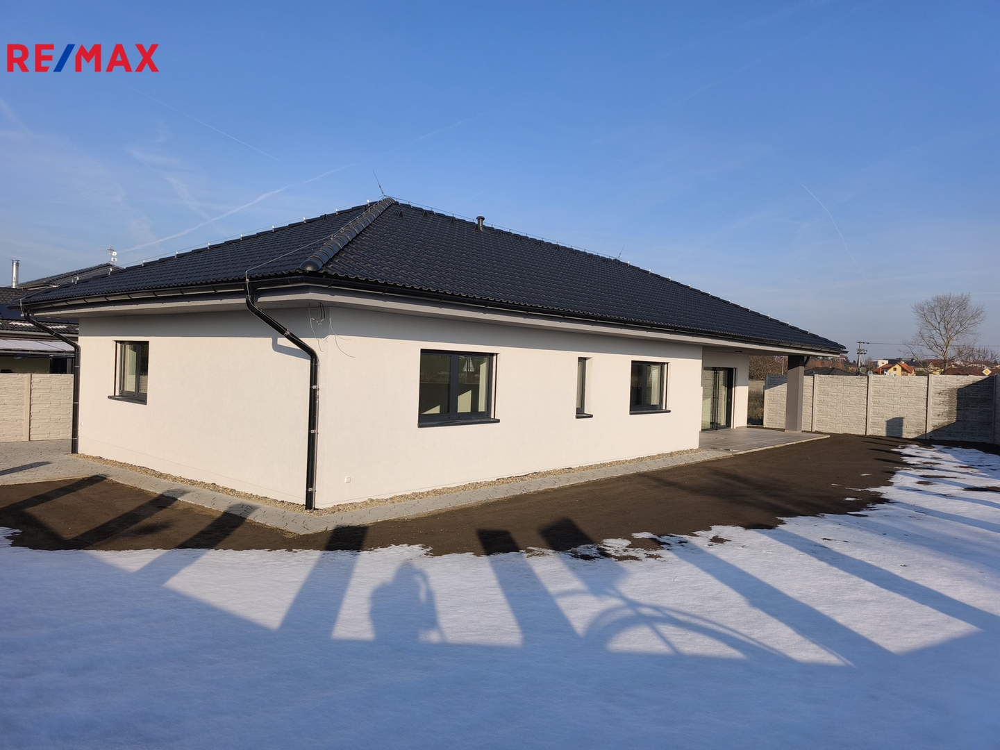Rodinný dům Vám nabízí velmi prostornou vstupní chodbu včetně luxusní vestavěné šatní skříně a botníkem vyrobené na míru, samostatnou toaletu se vstupem do technické místnosti s tepelným čerpadlem, místem na pračku, sušičku a úklidové prostředky. Dále velmi atraktivní koupelnu se sprchovým koutem, vanou, toaletou a dvoj umyvadlem s kosmetickou skříňkou a zrcadlem. Niky v obkladu koupelny tvoří praktický i designový prvek. Tato koupelna je praktická, maximálně prosvětlená a nabízí dostatek místa pro odpočinek i úložné prostory. V domě naleznete tři samostatné neprůchozí ložnice, z toho hlavní ložnice 17 m2 má svou vlastní šatnu 6,5 m2. Dominantou nemovitosti je obývací pokoj s kuchyňským a jídelním koutem. Kuchyně je vybavena moderními vestavěnými spotřebiči zn. Electrolux včetně myčky, indukční varné desky a velkoobjemové lednice s mrazákem. Obývací pokoj s jídelním a kuchyňským koutem tvoří jeden otevřený prostor, kde jednotlivé zóny plynule navazují a celek působí maximálně prostorně, nadčasově a vzdušně. Celý interiér je laděn v moderních tónech, které podporují pocit tepla. Prostor je ideální pro rodinný život i každodenní relaxaci, s důrazem na funkčnost, estetiku i propojení s exteriérem. Z obývacího pokoje naleznete vstup na terasu a zahradu. V oknech a balkónových dveří do zahrady jsou instalovány venkovní žaluzie, které zajišťují soukromí. Součástí pronájmu je kompletní osvětlení a sedací souprava. Nemovitost je řešena s důrazem na světlost, prostor a eleganci. Rodinný dům je bez předchozího užívání, čeká na prvního nájemce a již se ladí dokončovací práce (podlahové lišty, zahradní domek, plot, vjezdová brána, terénní úpravy atd.).