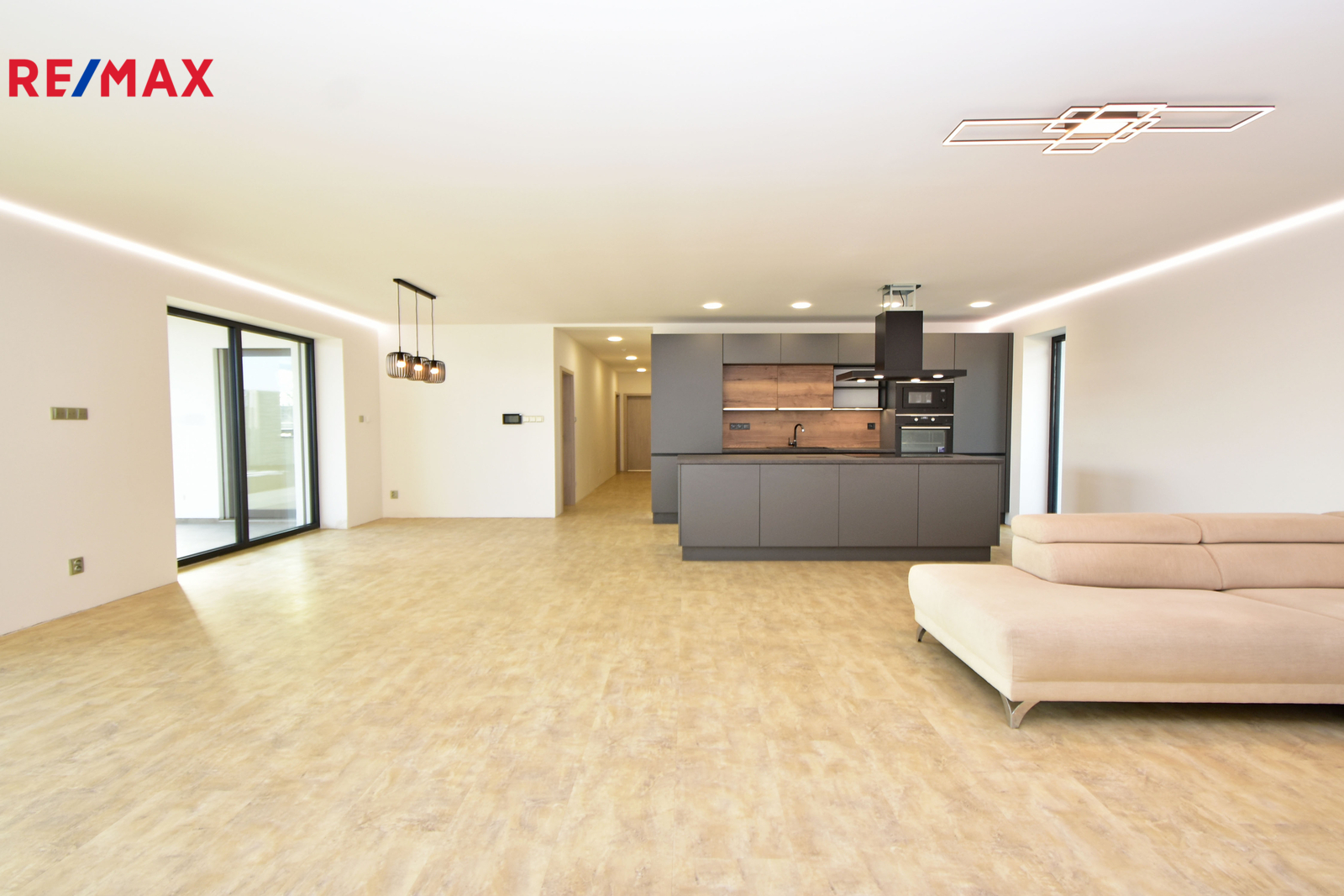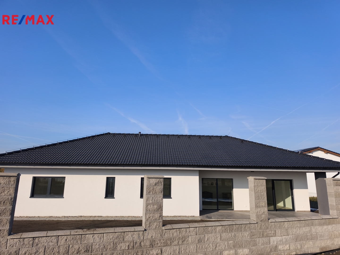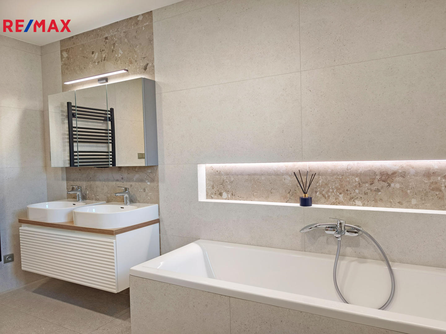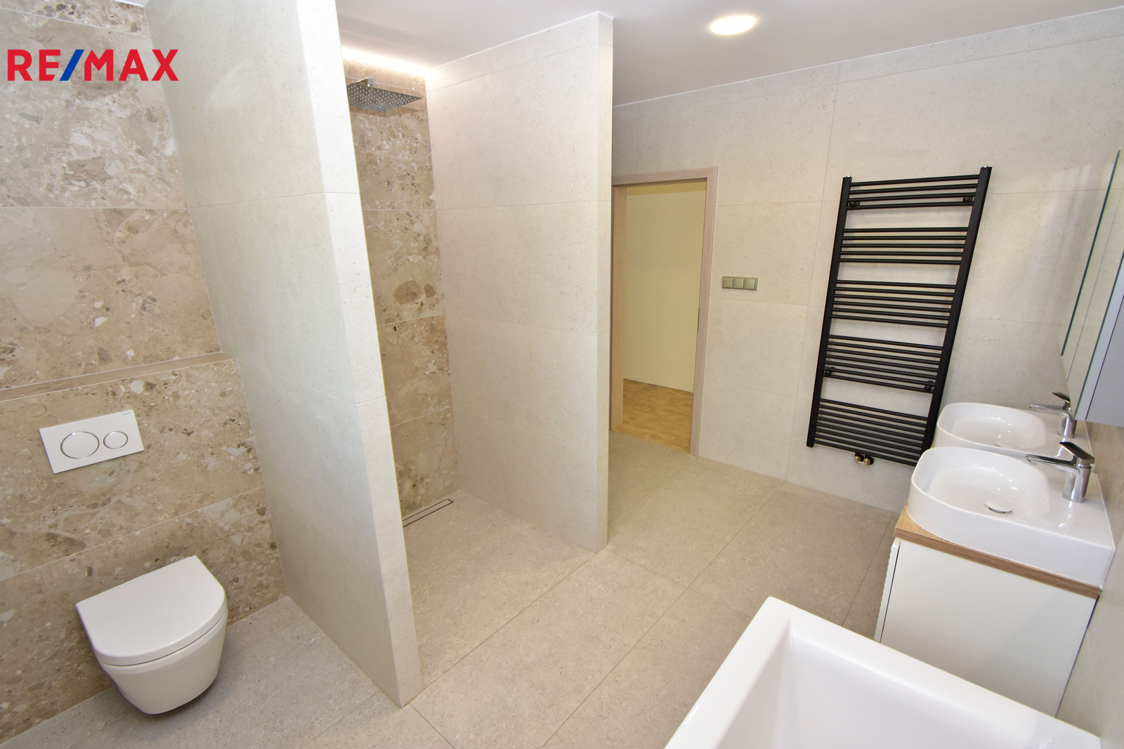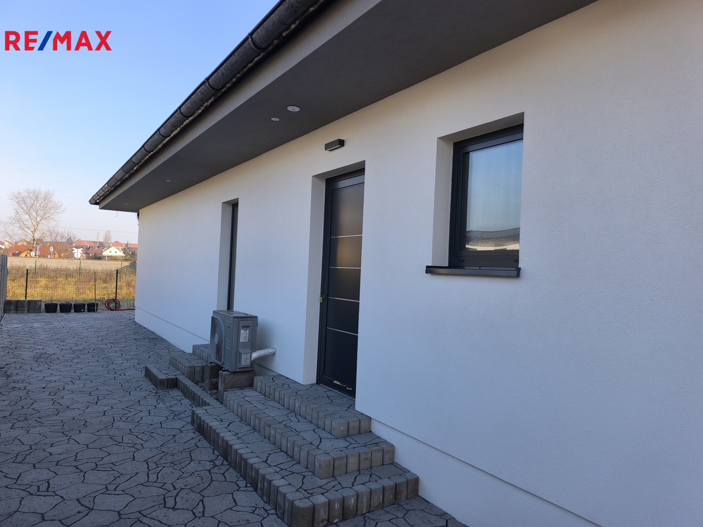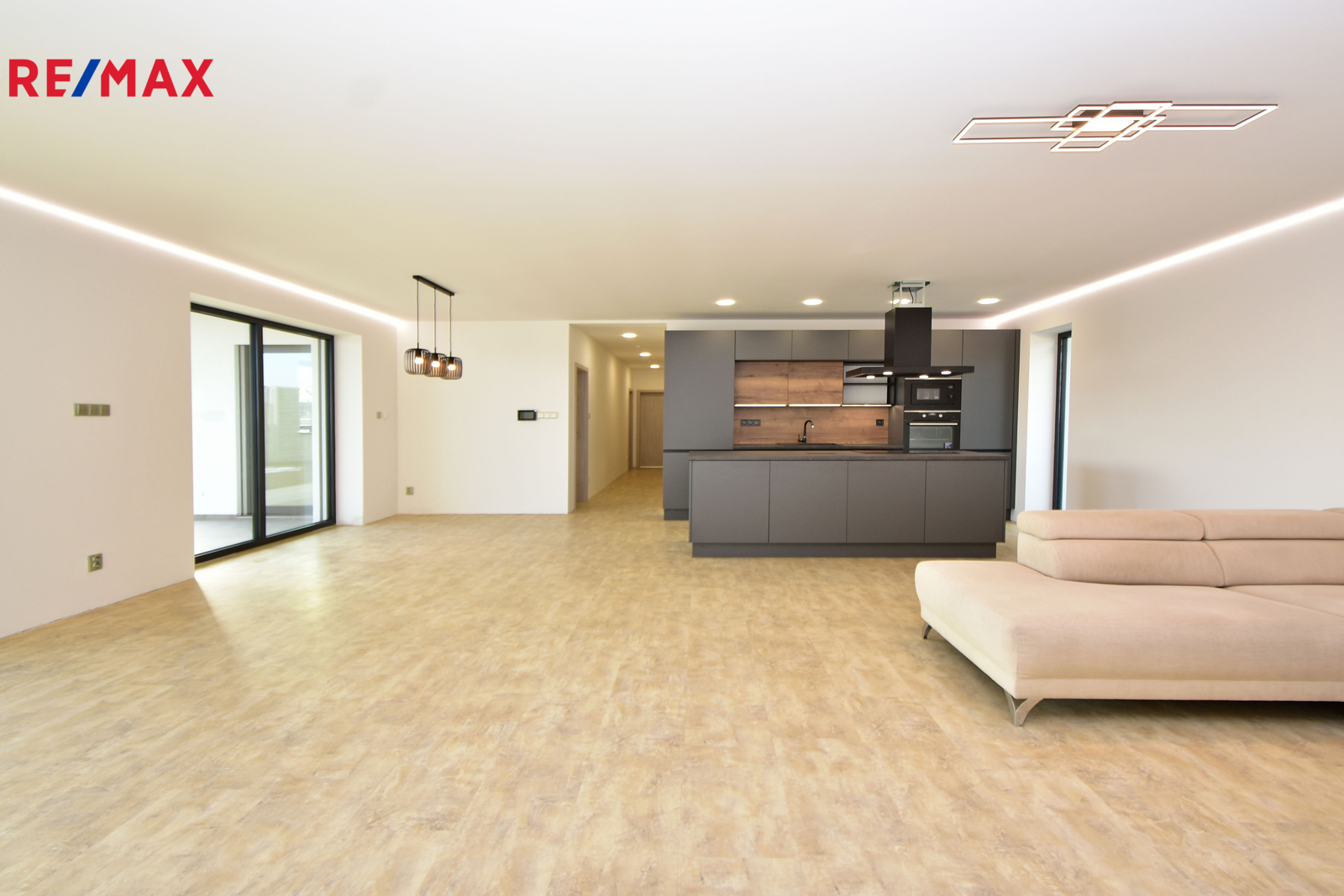 Rodinný dům Vám nabízí velmi prostornou vstupní chodbu včetně luxusní vestavěné šatní skříně a botníkem vyrobené na míru, samostatnou toaletu se vstupem do technické místnosti s tepelným čerpadlem, místem na pračku, sušičku a úklidové prostředky. Dále velmi atraktivní koupelnu se sprchovým koutem, vanou, toaletou a dvoj umyvadlem s kosmetickou skříňkou a zrcadlem. Niky v obkladu koupelny tvoří praktický i designový prvek. Tato koupelna je praktická, maximálně prosvětlená a nabízí dostatek místa pro odpočinek i úložné prostory. V domě naleznete tři samostatné neprůchozí ložnice, z toho hlavní ložnice 17 m2 má svou vlastní šatnu 6,5 m2. Dominantou nemovitosti je obývací pokoj s kuchyňským a jídelním koutem. Kuchyně je vybavena moderními vestavěnými spotřebiči zn. Electrolux včetně myčky, indukční varné desky a velkoobjemové lednice s mrazákem. Obývací pokoj s jídelním a kuchyňským koutem tvoří jeden otevřený prostor, kde jednotlivé zóny plynule navazují a celek působí maximálně prostorně, nadčasově a vzdušně. Celý interiér je laděn v moderních tónech, které podporují pocit tepla. Prostor je ideální pro rodinný život i každodenní relaxaci, s důrazem na funkčnost, estetiku i propojení s exteriérem. Z obývacího pokoje naleznete vstup na terasu a zahradu. V oknech a balkónových dveří do zahrady jsou instalovány venkovní žaluzie, které zajišťují soukromí. Součástí pronájmu je kompletní osvětlení a sedací souprava. Nemovitost je řešena s důrazem na světlost, prostor a eleganci. Rodinný dům je bez předchozího užívání, čeká na prvního nájemce a již se ladí dokončovací práce (podlahové lišty, zahradní domek, plot, vjezdová brána, terénní úpravy atd.).