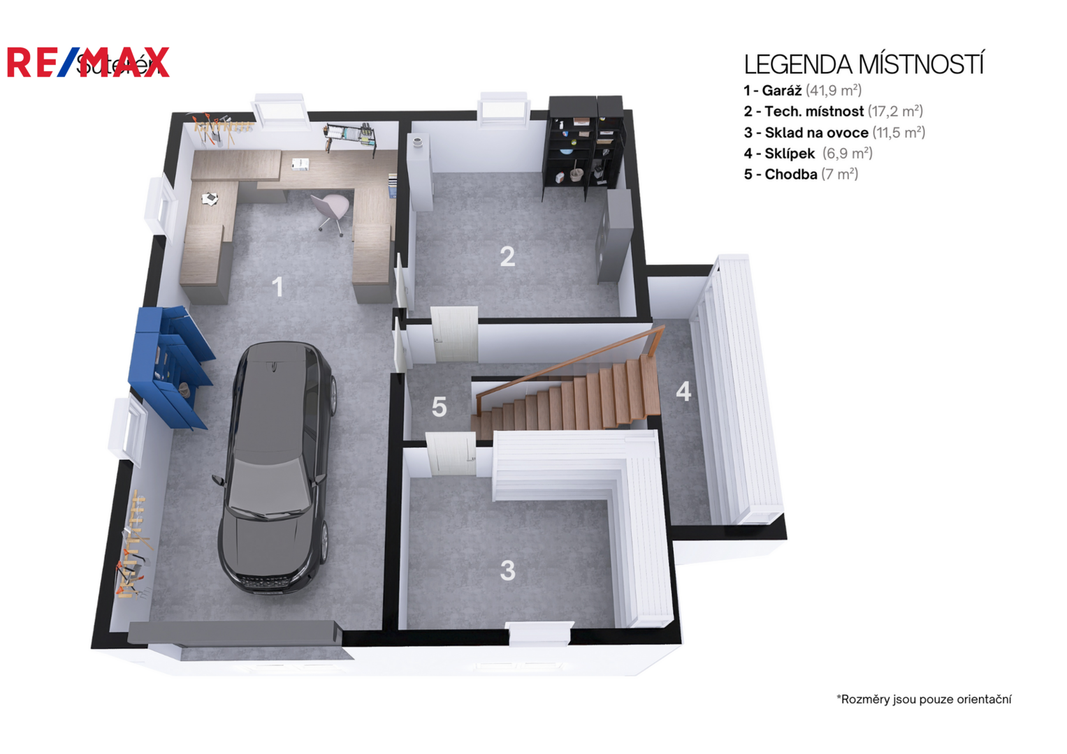 - suterén: garáž, dílna, technická místnost a prostorné sklepy