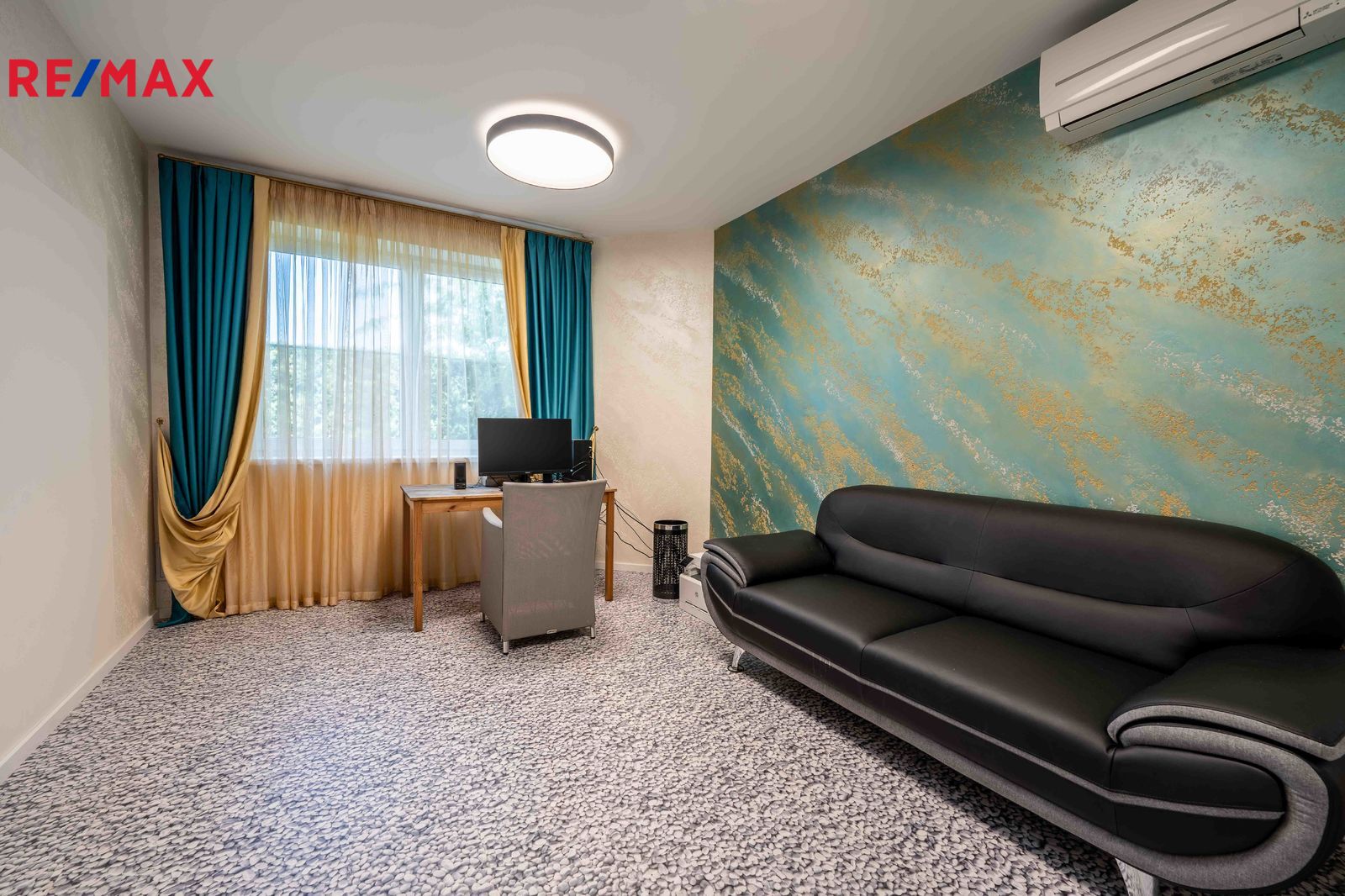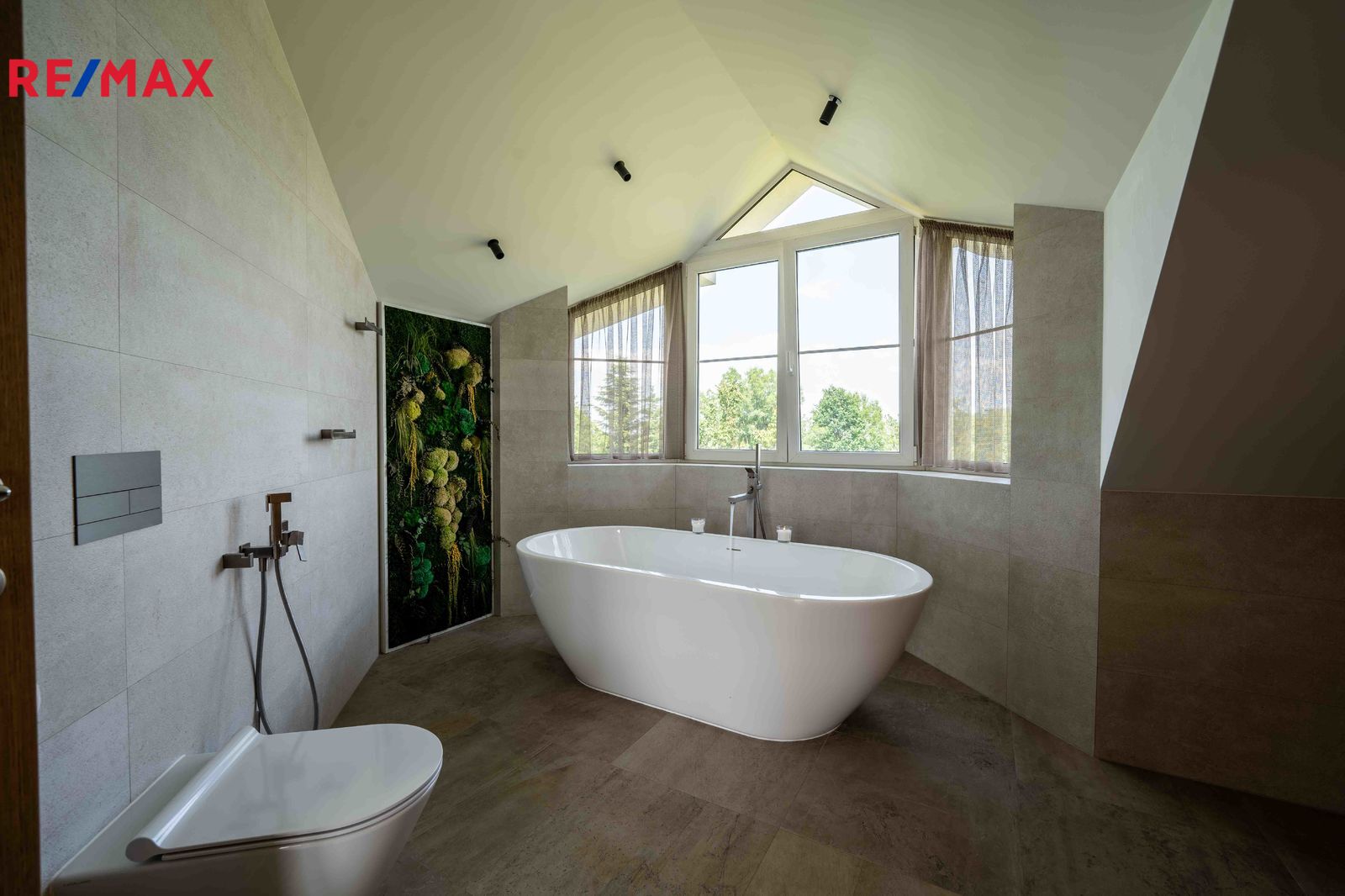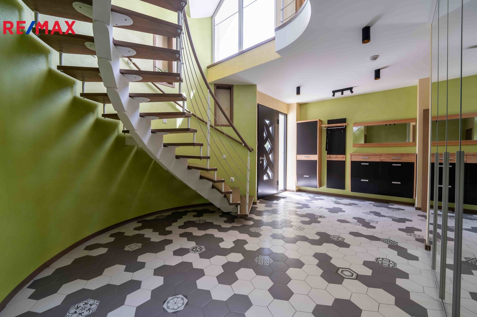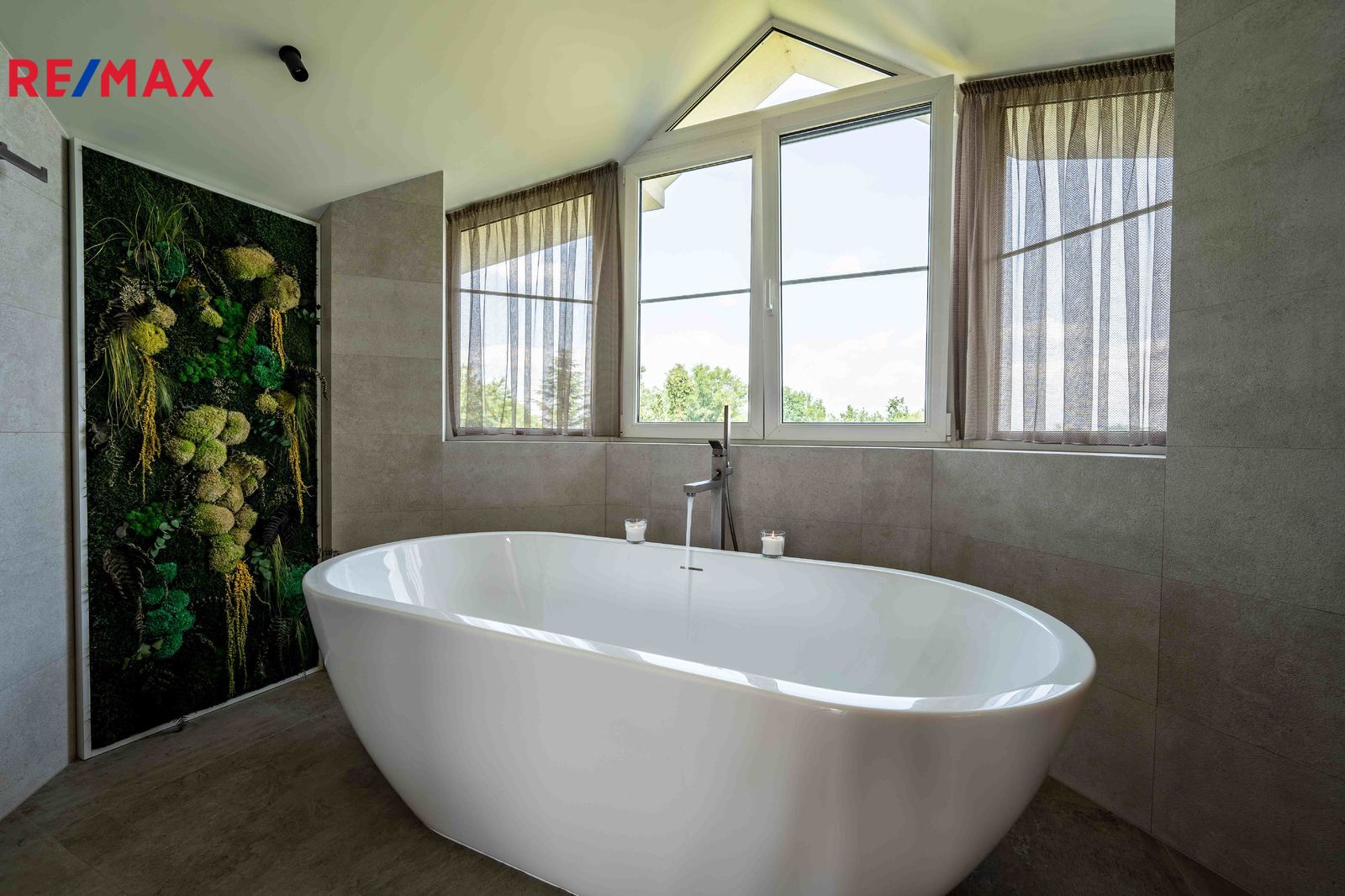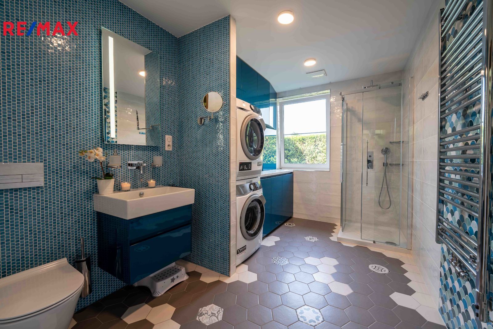 Dále se v přízemi nachází pracovna, koupelna s prádelnou zónou, WC a a sprchovým koutem. Vstup z technické místnosti do garáže pro 2 auta+ parkovaní pro 2 auta před garáže. Přízemí domu má podlahové topení a klimatizace v pokojích.