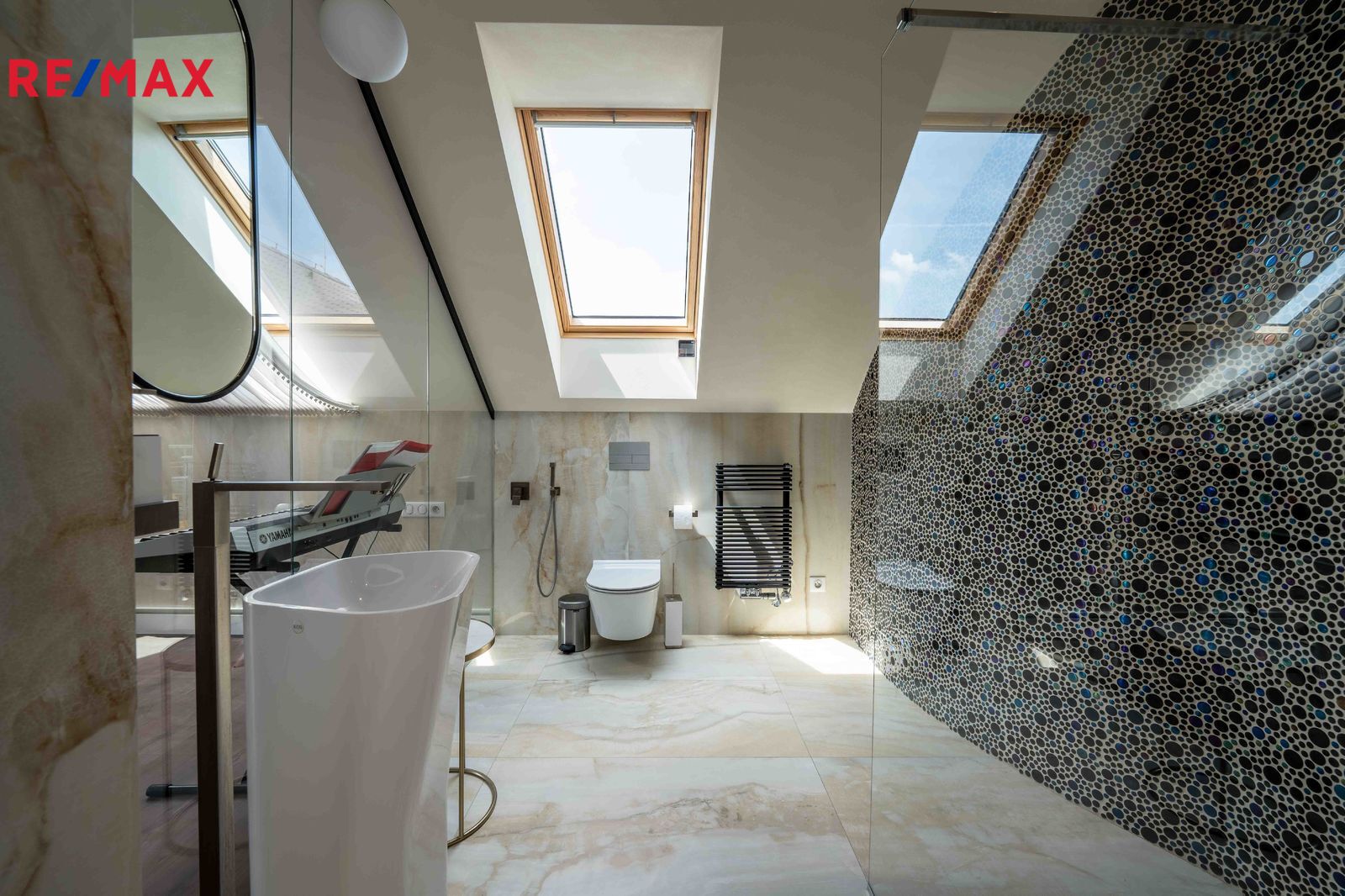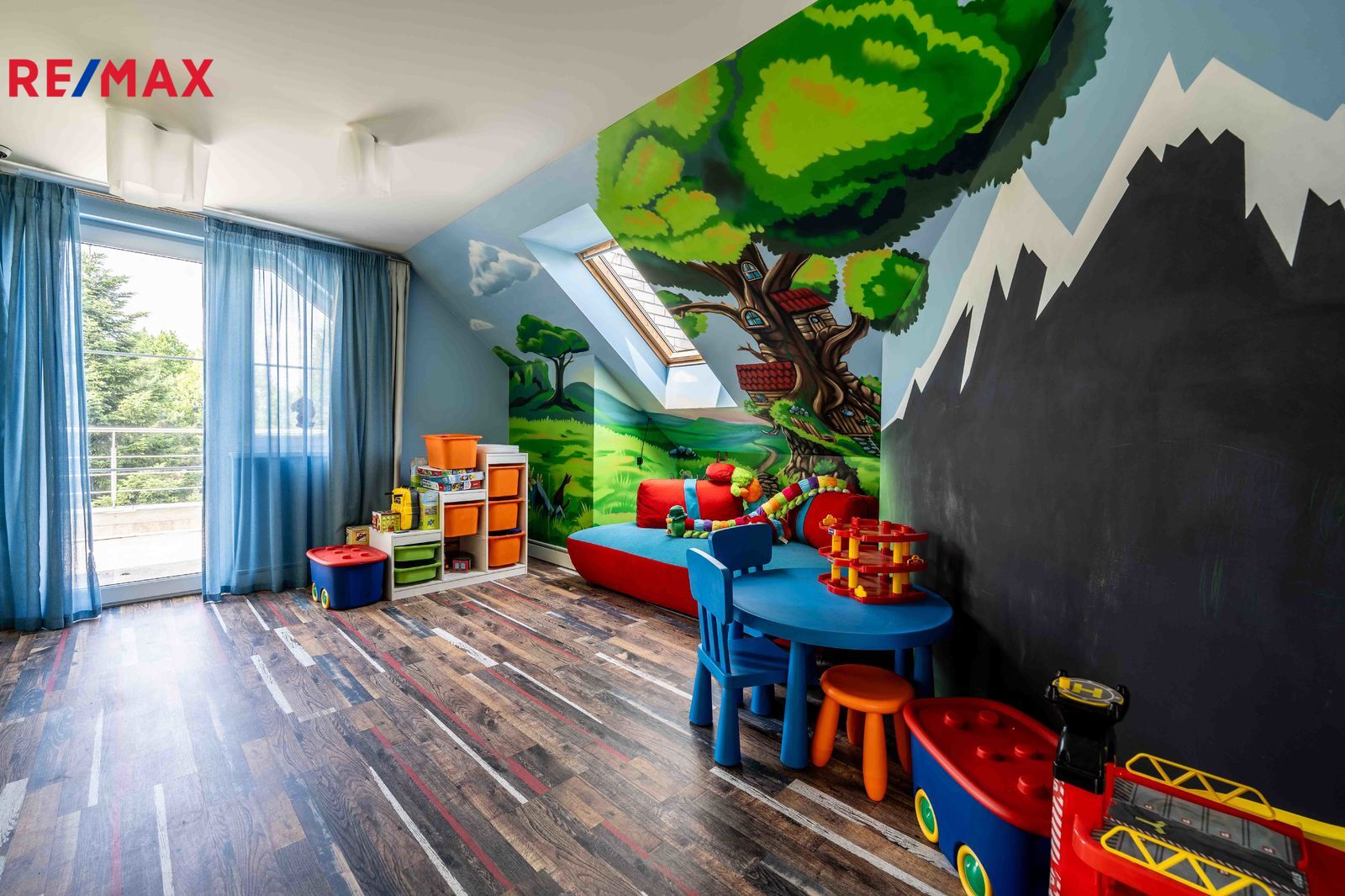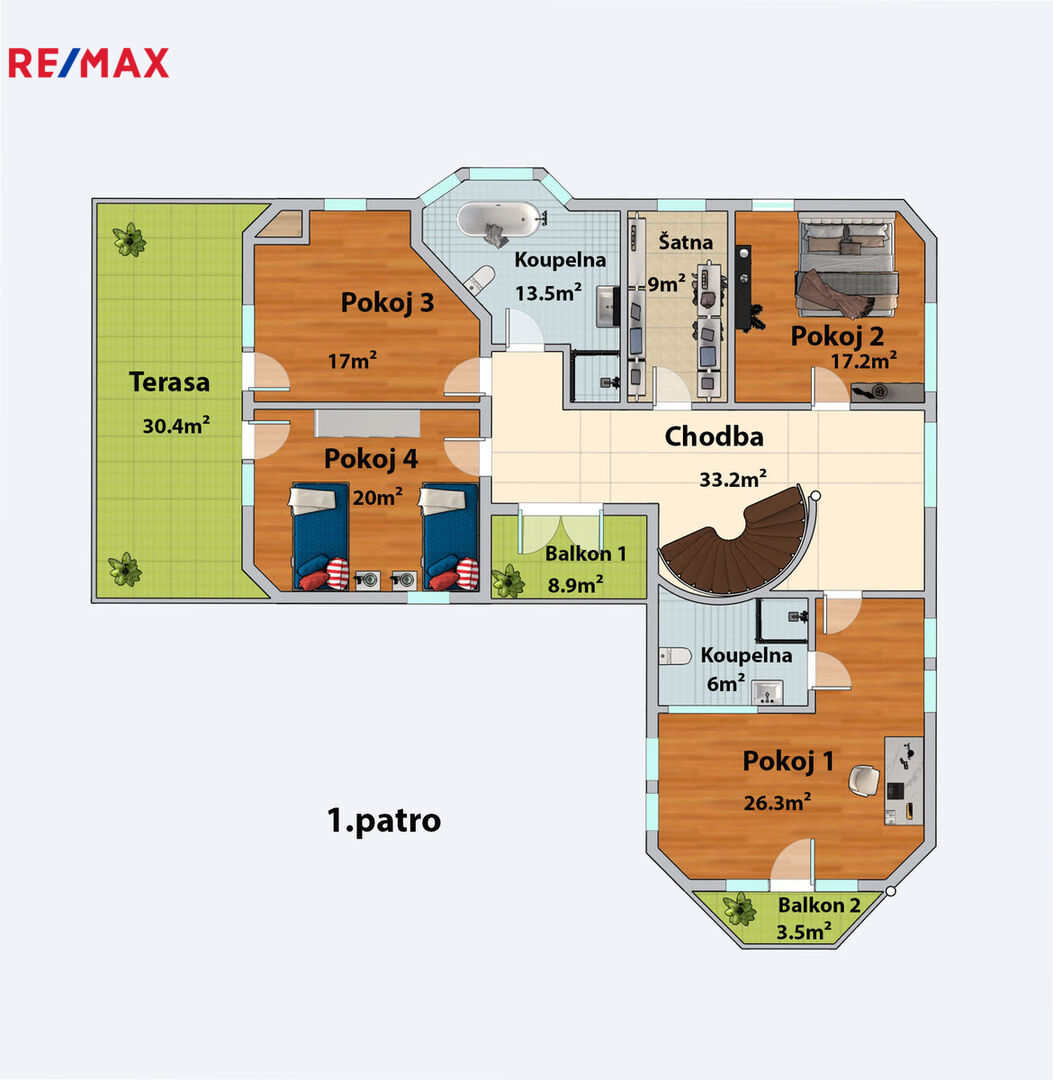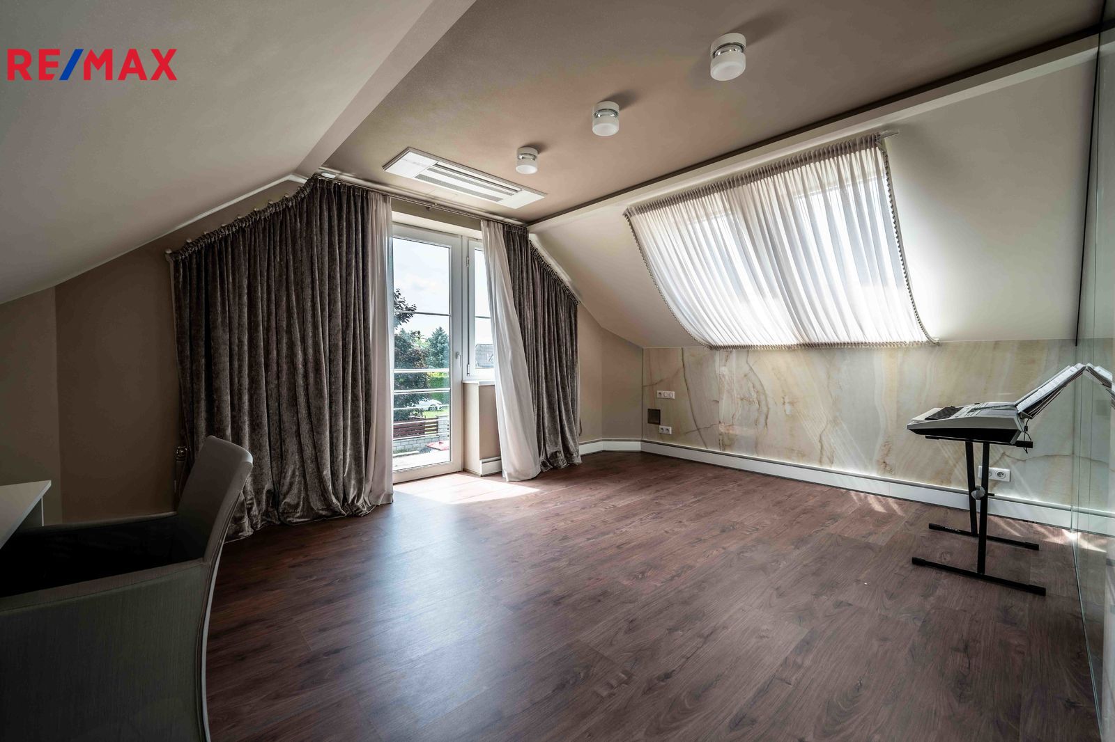 Podkroví: chodba s balkonem, 2 dětských pokoje se společnou terasou, koupelna s vanou, sprchovým koutem a WC. Dále je šatna s oknem, 1 ložnice, a 1 manželský pokoj s balkonem a vlastní koupelnou (WC+ sprchový kout). Patro má lištové vytápění a klimatizace v pokojích.