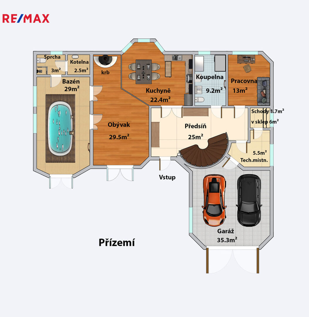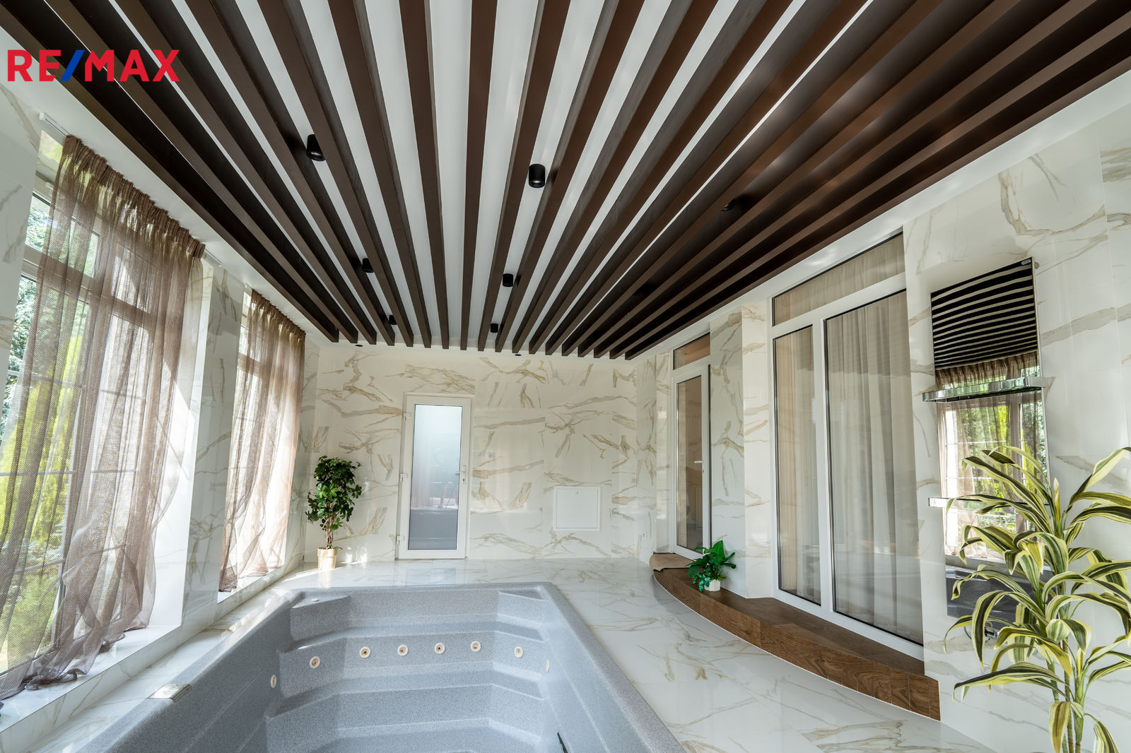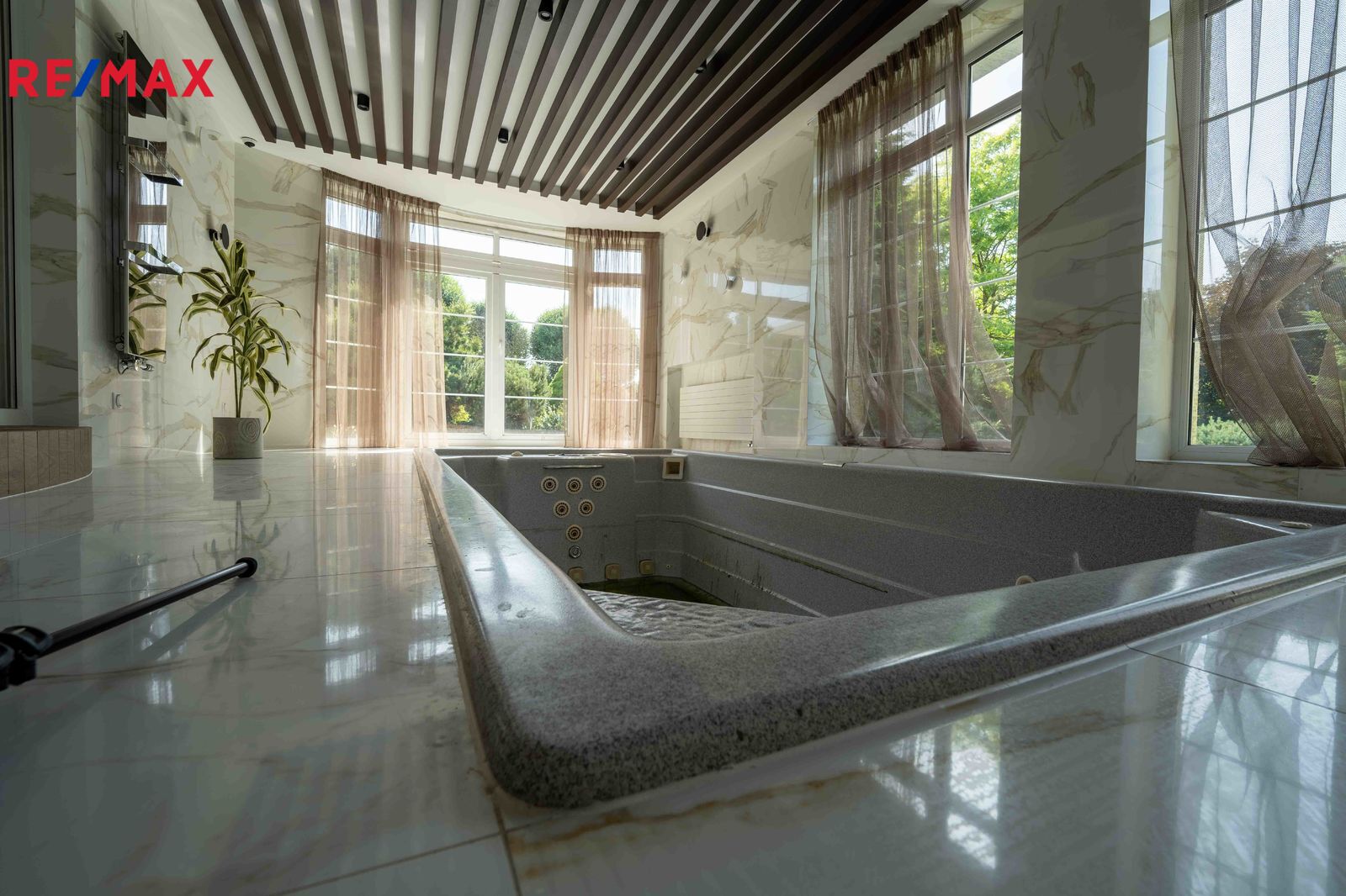 Přízemí : vstupní hala 25 m2, obývací pokoj s krbem a kuchyňským koutem celkovou plochou 52 m2. Z obývacího prostoru jsou vstupy na terasu, a zimní zahradu s luxusním designovým bazénem s vířivkou, koupelnou se srpovým koutem a WC. Vedle koupelny je technická místnost s tepelným systémem Buderus.