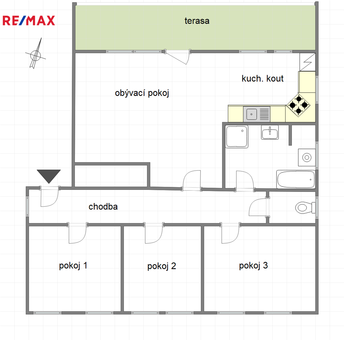 Nabízíme dlouhodobý pronájem nezařízeného bytu 4+kk v cihlovém třípodlažním domě. Byt se nachází ve druhém patře, bez výtahu. Uprostřed bytu vede chodba, z níž lze vlevo vstoupit do prostorného obývacího pokoje s kuchyňským koutem. Z obývacího pokoje vedou dveře na terasou s úchvatným výhledem na Krušné hory, je odsud vidět Komáří hůrka i Doubravská hora. Vpravo z chodby vedou troje dveře do ložnic, všechny jsou neprůchozí. Okna v ložnicích jsou střešní. Na konci chodby se nachází koupelna s vanou a sprchovým koutem a pračkou, vedle samostatné WC. Topení a ohřev vody zajišťuje plynový kotel.