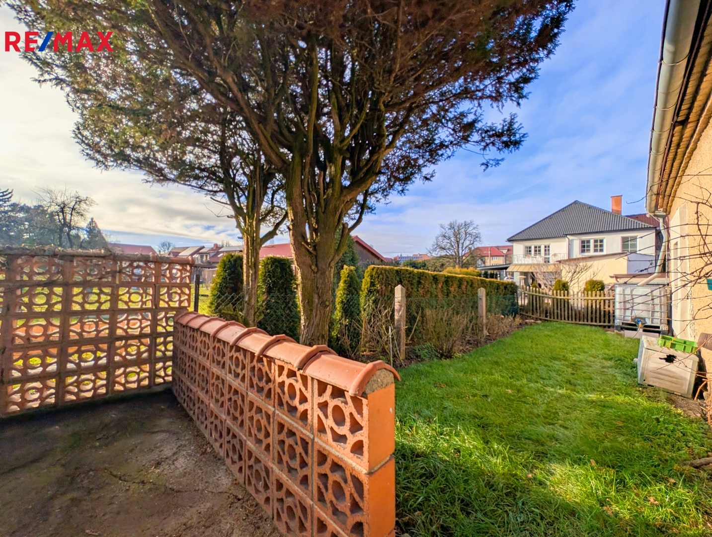 Pozemek o celkové výměře 472 m² je oplocený a částečně terasovitý. Zahrada je orientovaná na jih a díky jabloním nabízí příjemné soukromí. Nádvoří u domu je rovinaté a umožňuje parkování jednoho vozu. Druhé auto lze zaparkovat v garáži (22.4 m² ) a další místo je možné před domem na ulici. Na nádvoří se nachází také podzemní sklípek.