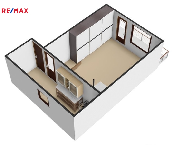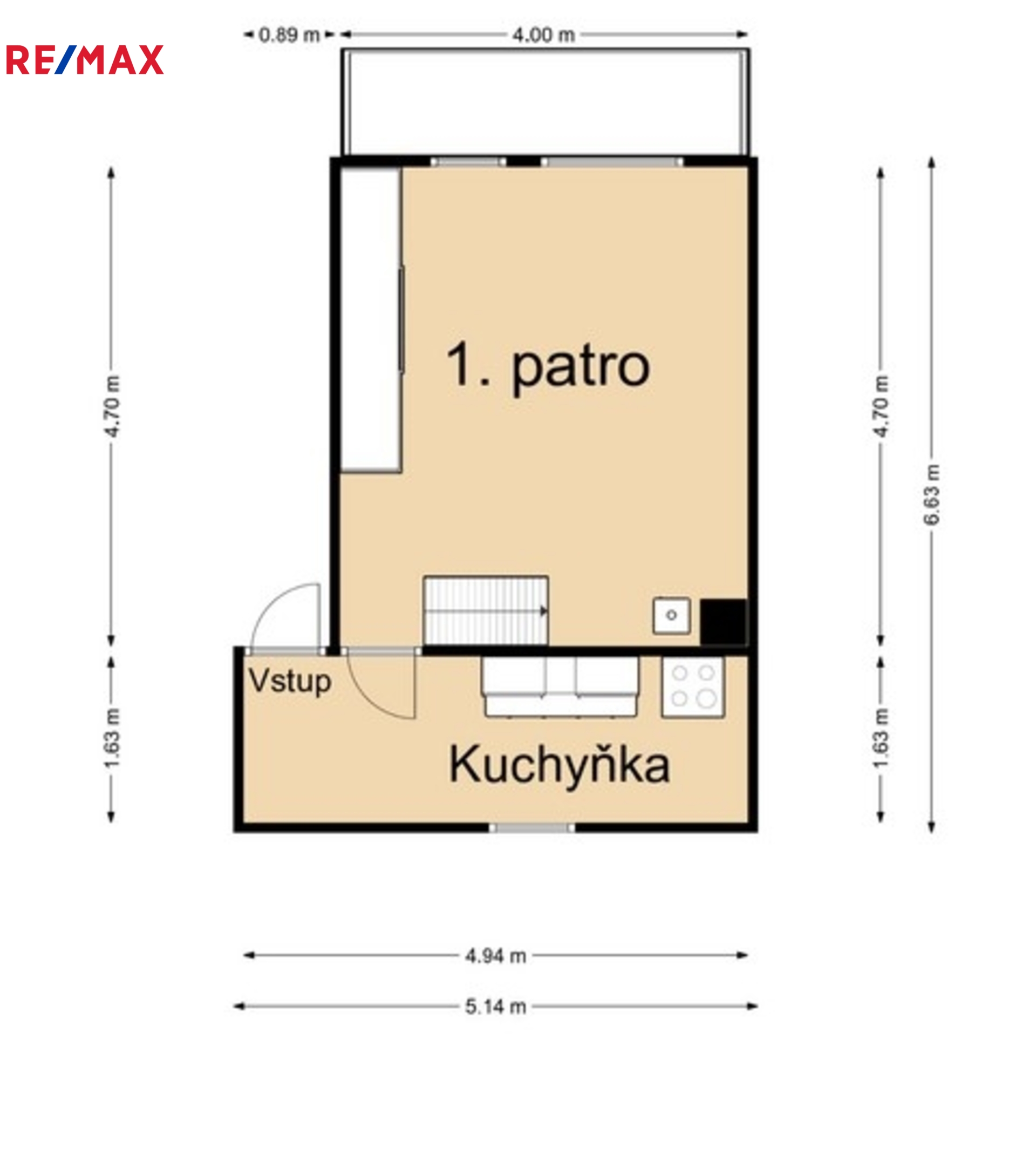 ✔1. patro - 4,7 x 3,77m (výška stropu 2,3m) + kuchyňka 4,93 x 1,63m