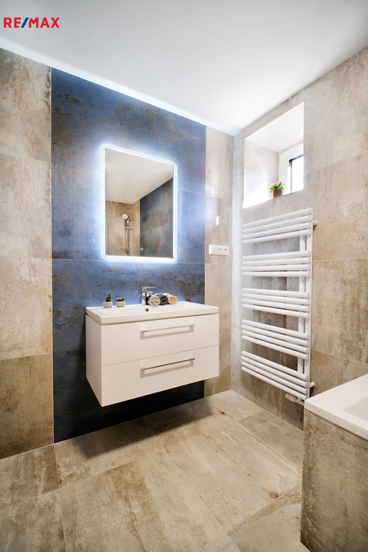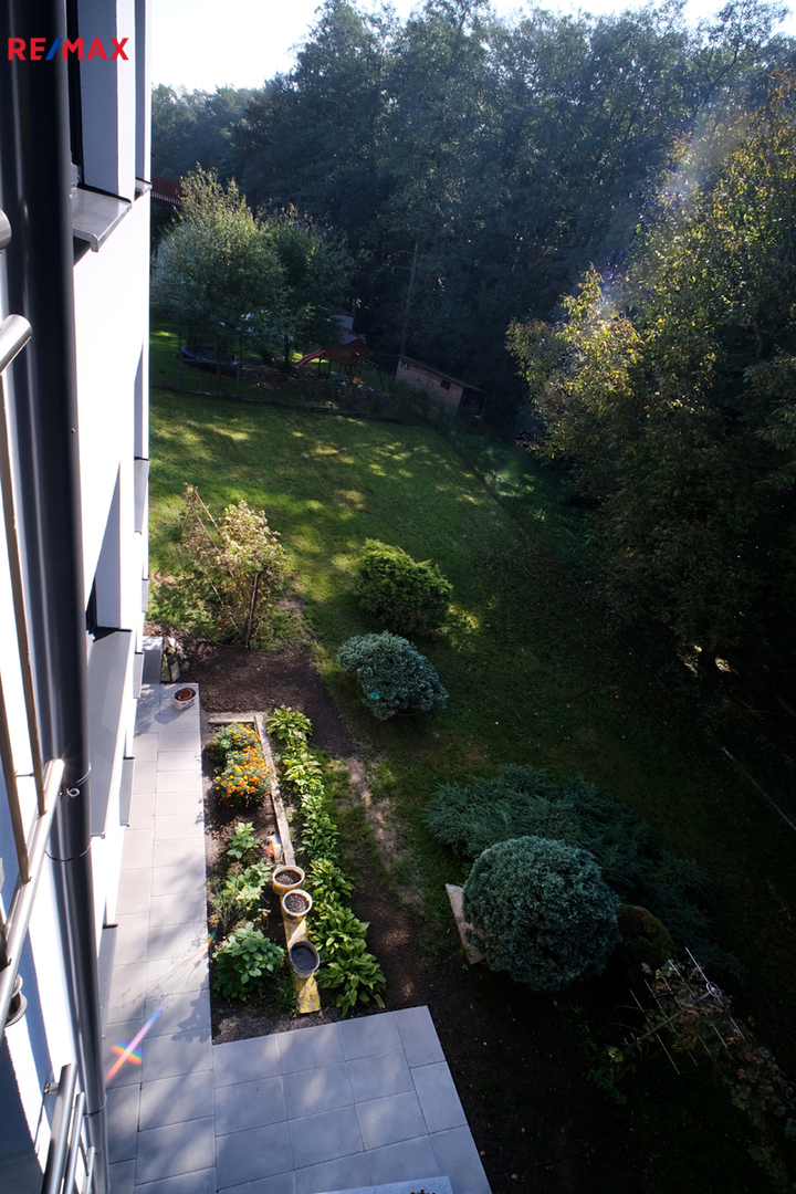 Byty jsou - až na mírné designové odlišnosti v řešení koupelen a kuchyňských obkladů - zcela identické včetně půdorysu, jeden v prvním nadzemním podlaží a druhý ve druhém. Společný vstup a veranda, poté samostatné vstupy do jednotlivých bytů. Ve fotogalerii najdete také foto domu jako celku i foto společných prostor.