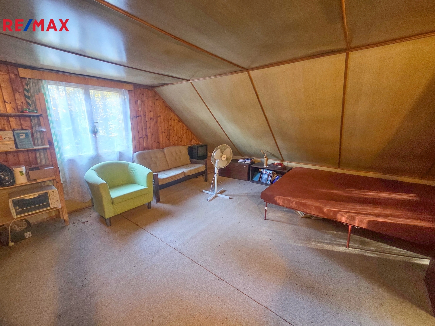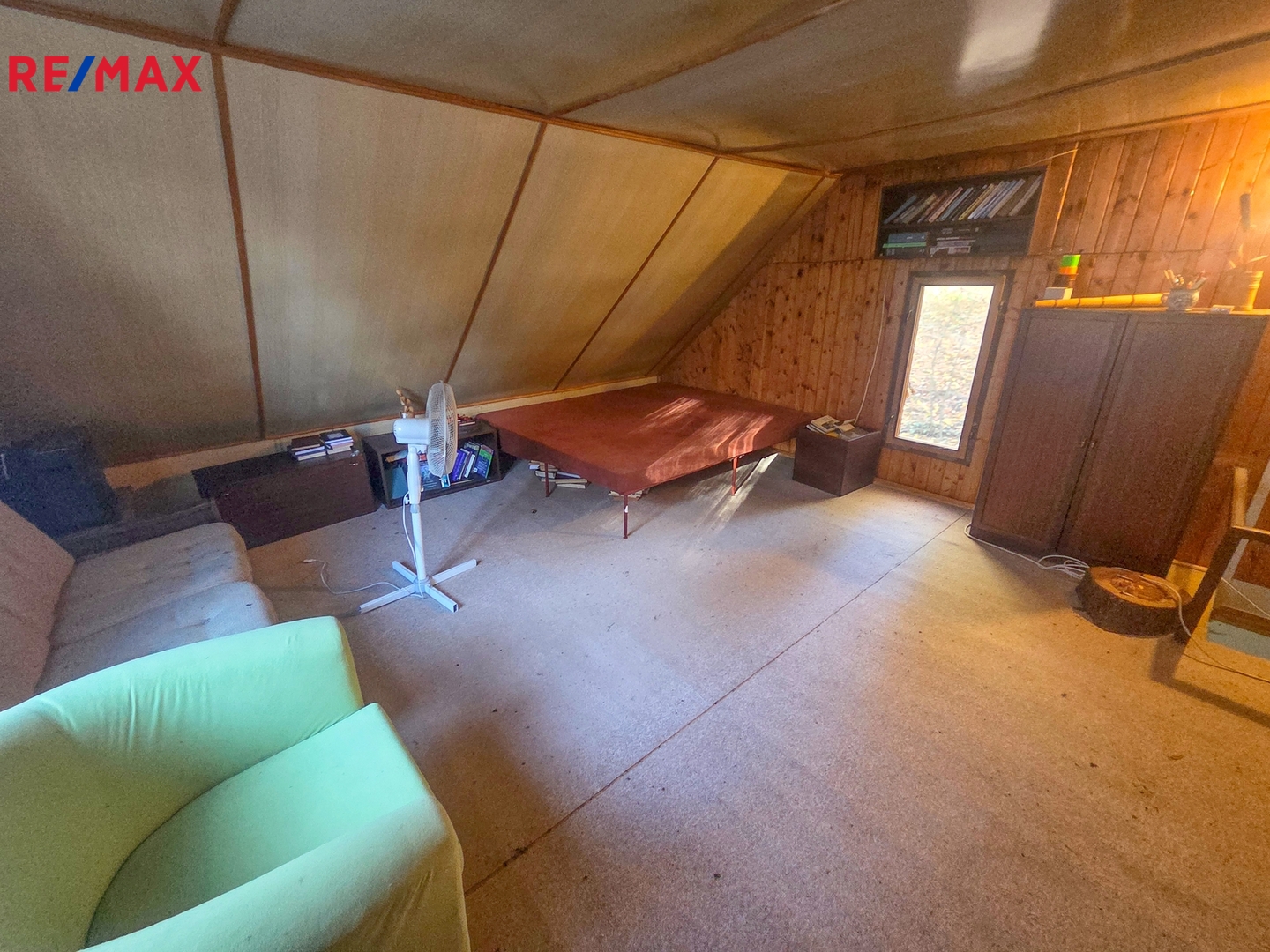 Do podkroví se vchází dřevěnými schody z obývacího pokoje. V podkroví se nachází pokoj (20 m2) s nízkou výškou.