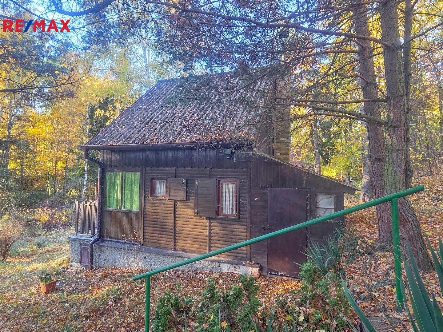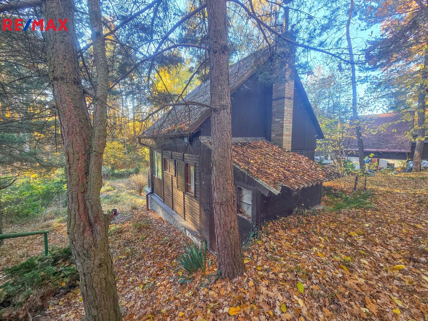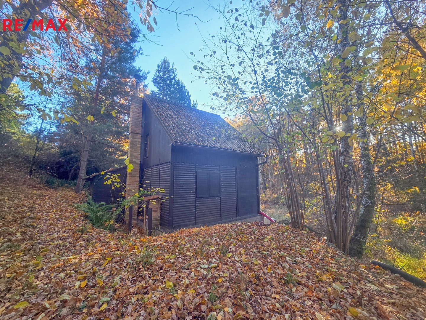 Chata o zastavěné ploše 30 m2 má dvě nadzemní patra a nachází se na samotném konci chatové oblasti.