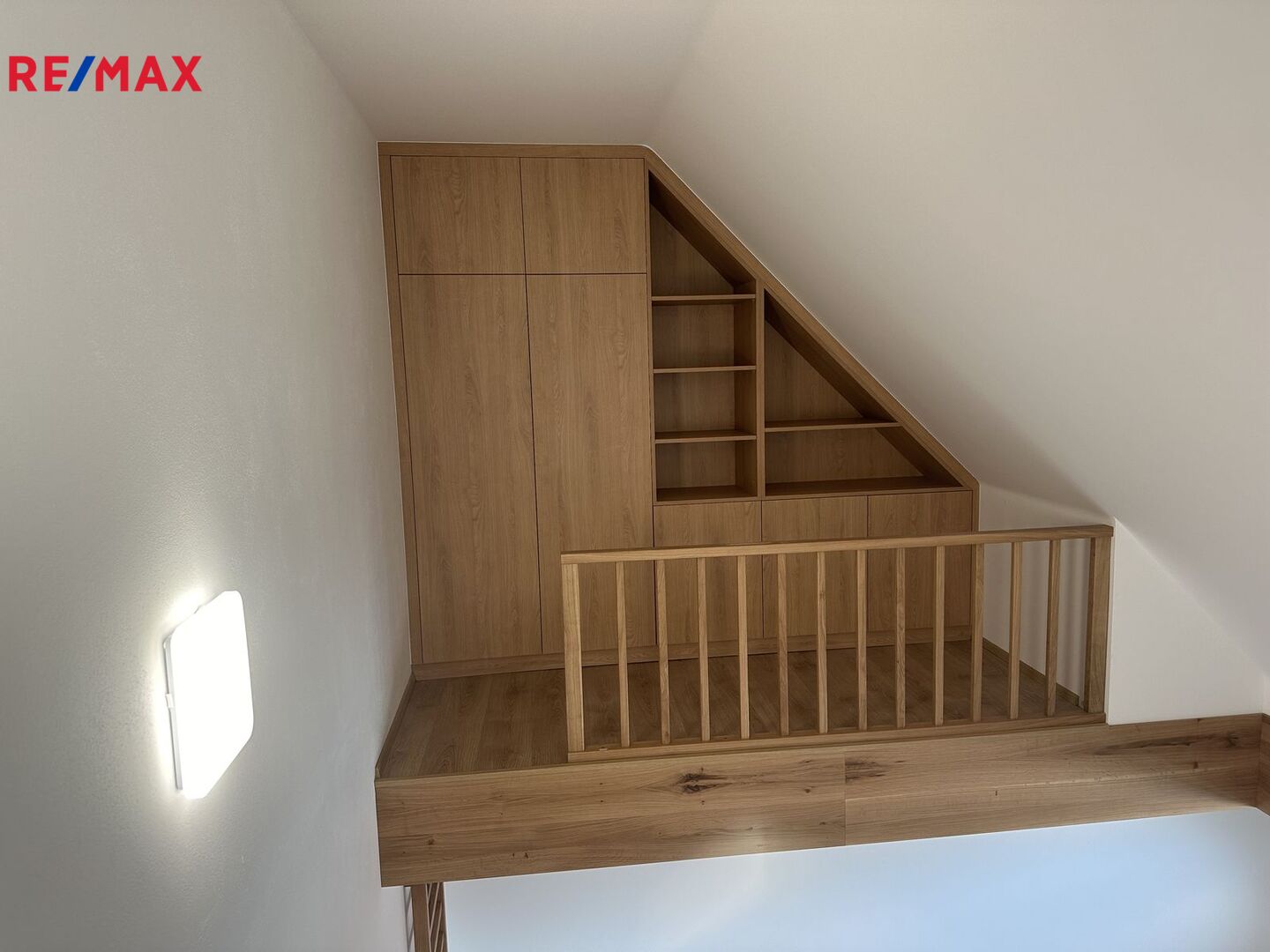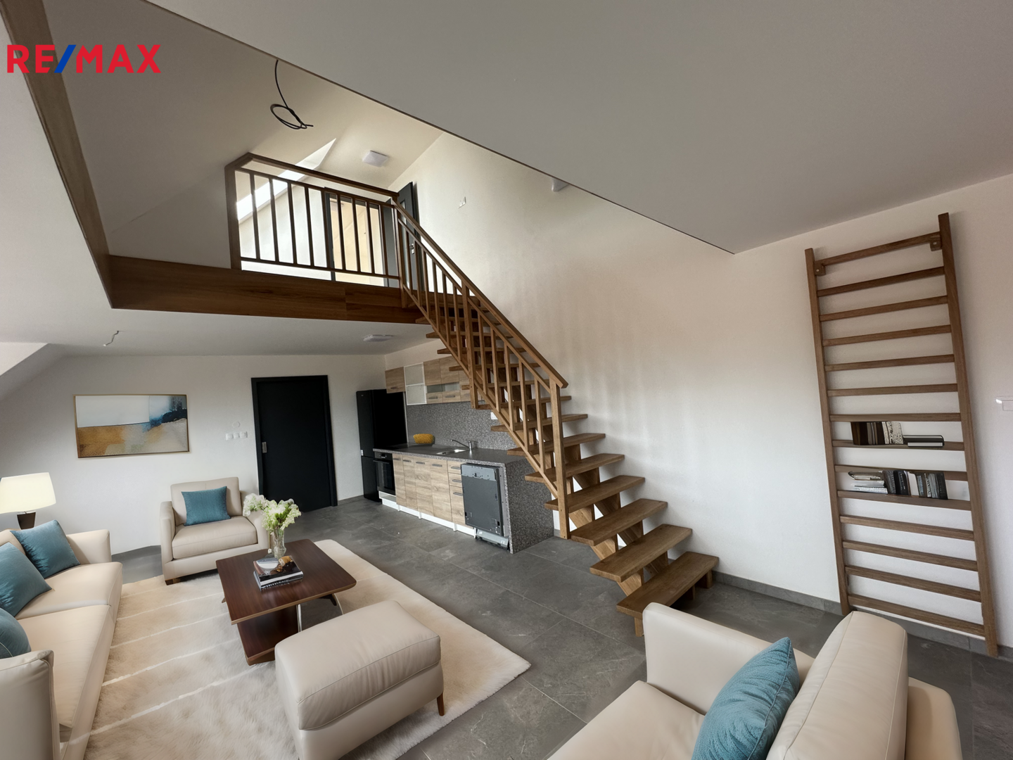 Do mezonetu s ložnicí vyjdeme po pohodlném dřevěném schodišti. Na protější straně od ložnice je umístěn oddechový koutek s knihovnou, který je přístupný po žebříku umístěném na stěně vedle schodiště.