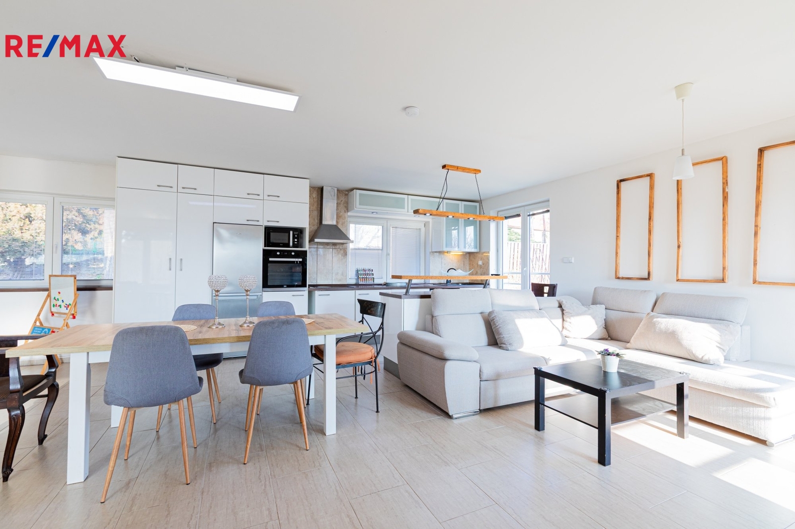 Dispozice je promyšlená pro rodinu: prostorný obývací pokoj s kuchyní (49 m²), pokoj pro chlapce (12,5 m²), dívčí pokoj (11 m²) a ložnice rodičů (22 m²) se samostatnou šatnou (3 m²). Všechny obytné místnosti jsou orientovány na jih, což zajišťuje dostatek světla během dne. Vytápění i ohřev vody je řešen plynovým kotlem – provozně úsporné a komfortní řešení.