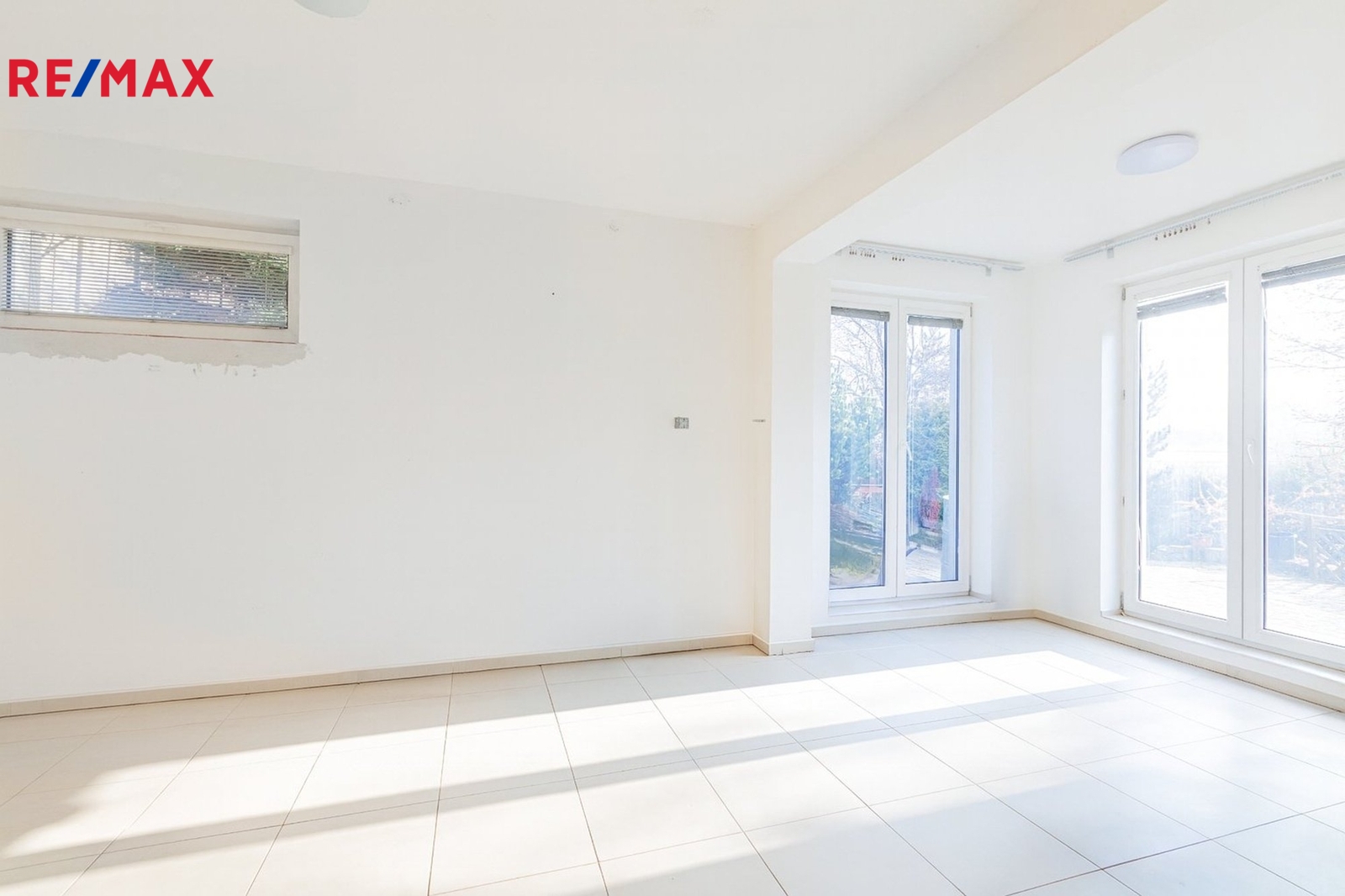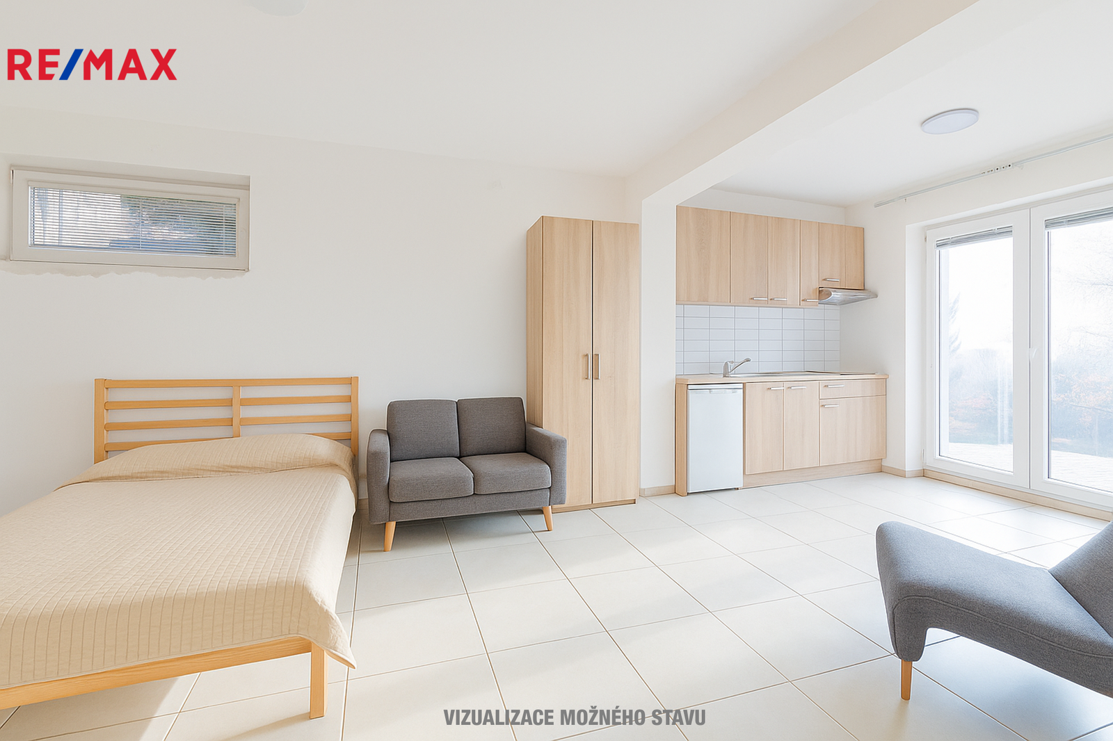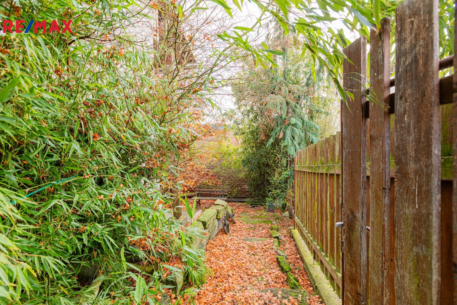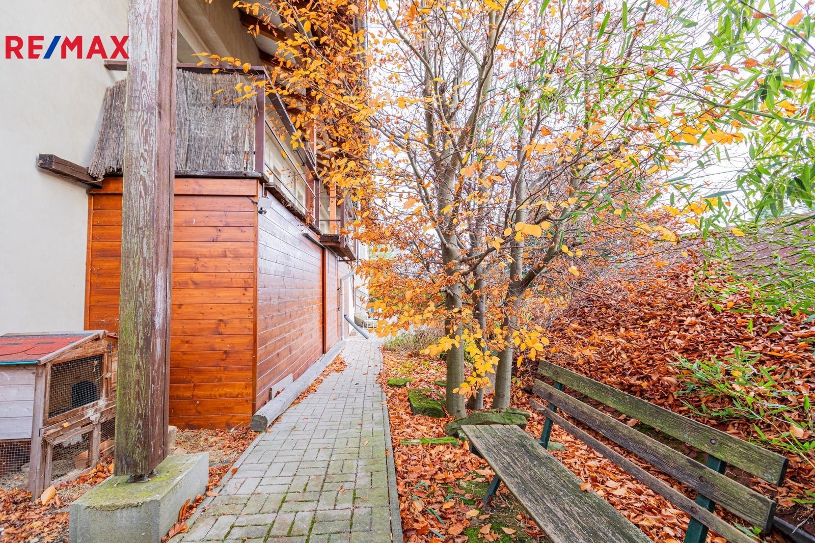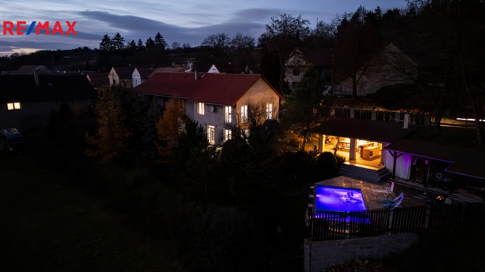 Na dům plynule navazuje venkovní terasa s kuchyní a samostatným WC – praktické zázemí pro setkávání s rodinou a přáteli. Bezprostředně u terasy je bazén 3,3 x 6,5 metru se slanou vodou a terasovým ochozem, dále venkovní ohniště a sauna pro 6 osob. K dispozici je také dílna. Okrasná zahrada s jezírkem vytváří klidné mikroklima a příjemné soukromí. Ve spodní části pozemku je vjezd a kryté stání pro auta. Přístup do domu je bezbariérový přímo z ulice.