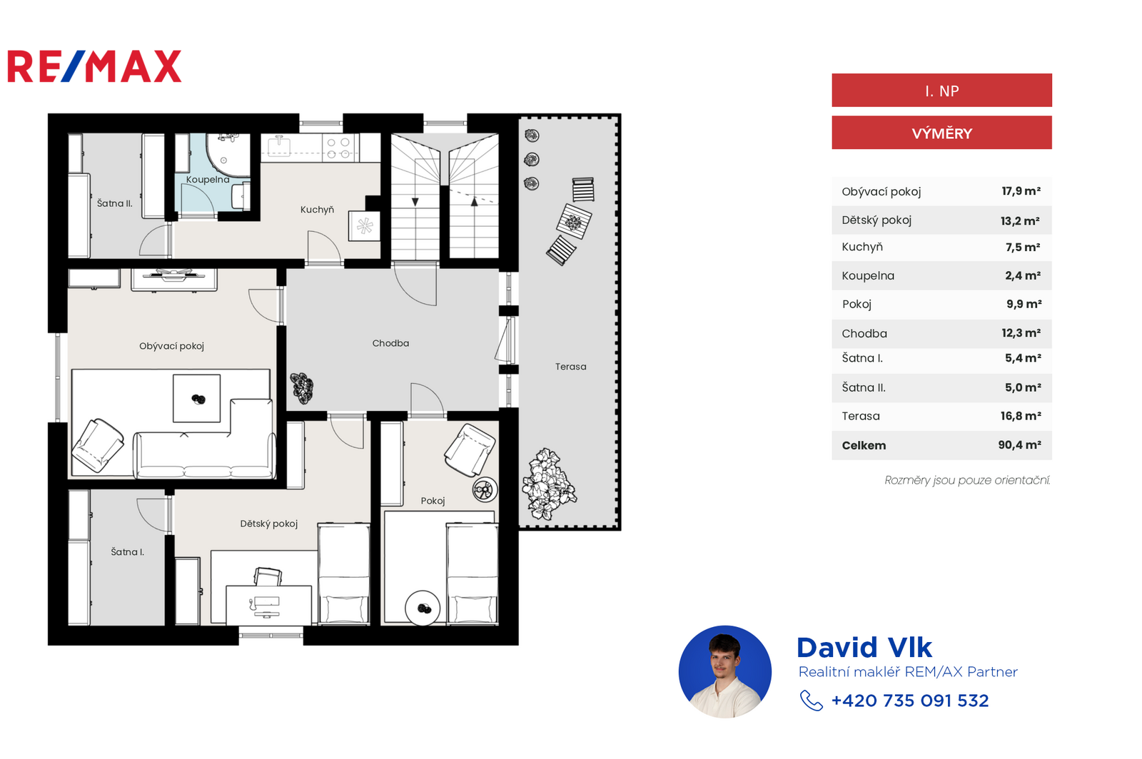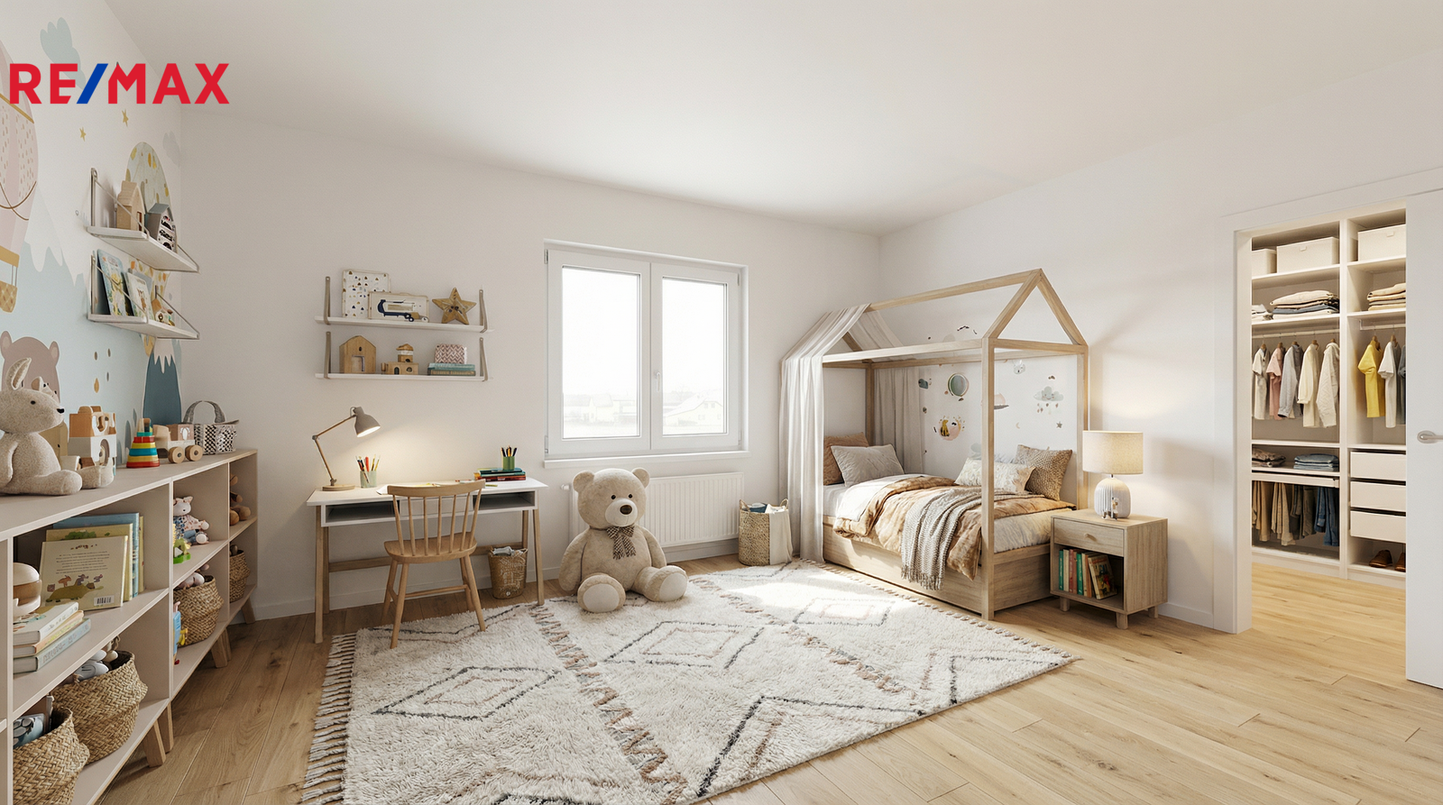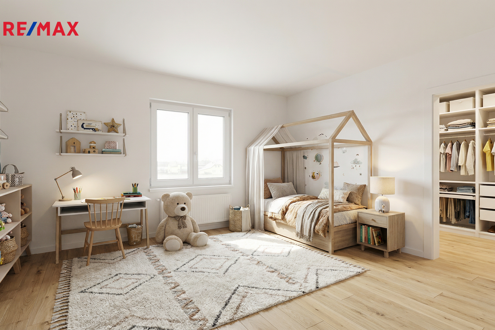 První nadzemní podlaží o ploše 90 m² tvoří plnohodnotná, dokončená bytová jednotka. Nachází se zde vstupní chodba s úložným prostorem, prostorná kuchyně s jídelním koutem, obývací pokoj, ložnice, koupelna a samostatné WC. Vše je ve stavu umožňujícím okamžité bydlení, ideální pro rodinné jádro bez nutnosti větších počátečních úprav.