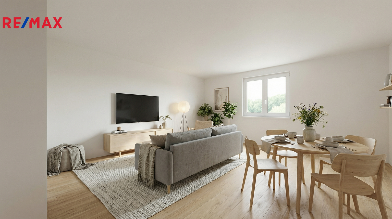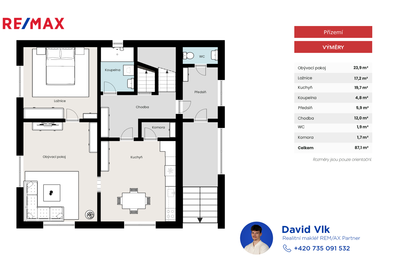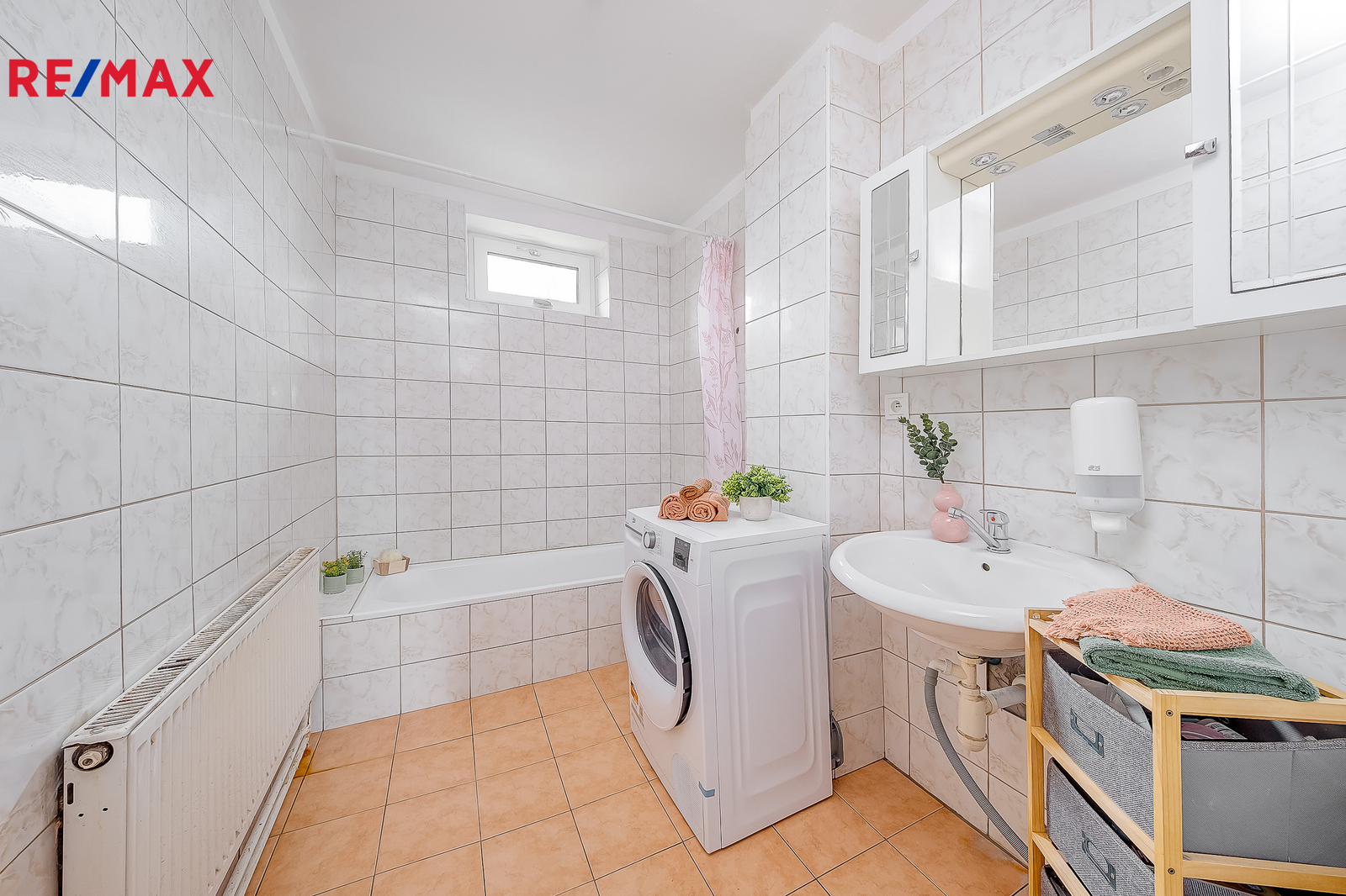 První nadzemní podlaží o ploše 90 m² tvoří plnohodnotná, dokončená bytová jednotka. Nachází se zde vstupní chodba s úložným prostorem, prostorná kuchyně s jídelním koutem, obývací pokoj, ložnice, koupelna a samostatné WC. Vše je ve stavu umožňujícím okamžité bydlení, ideální pro rodinné jádro bez nutnosti větších počátečních úprav.