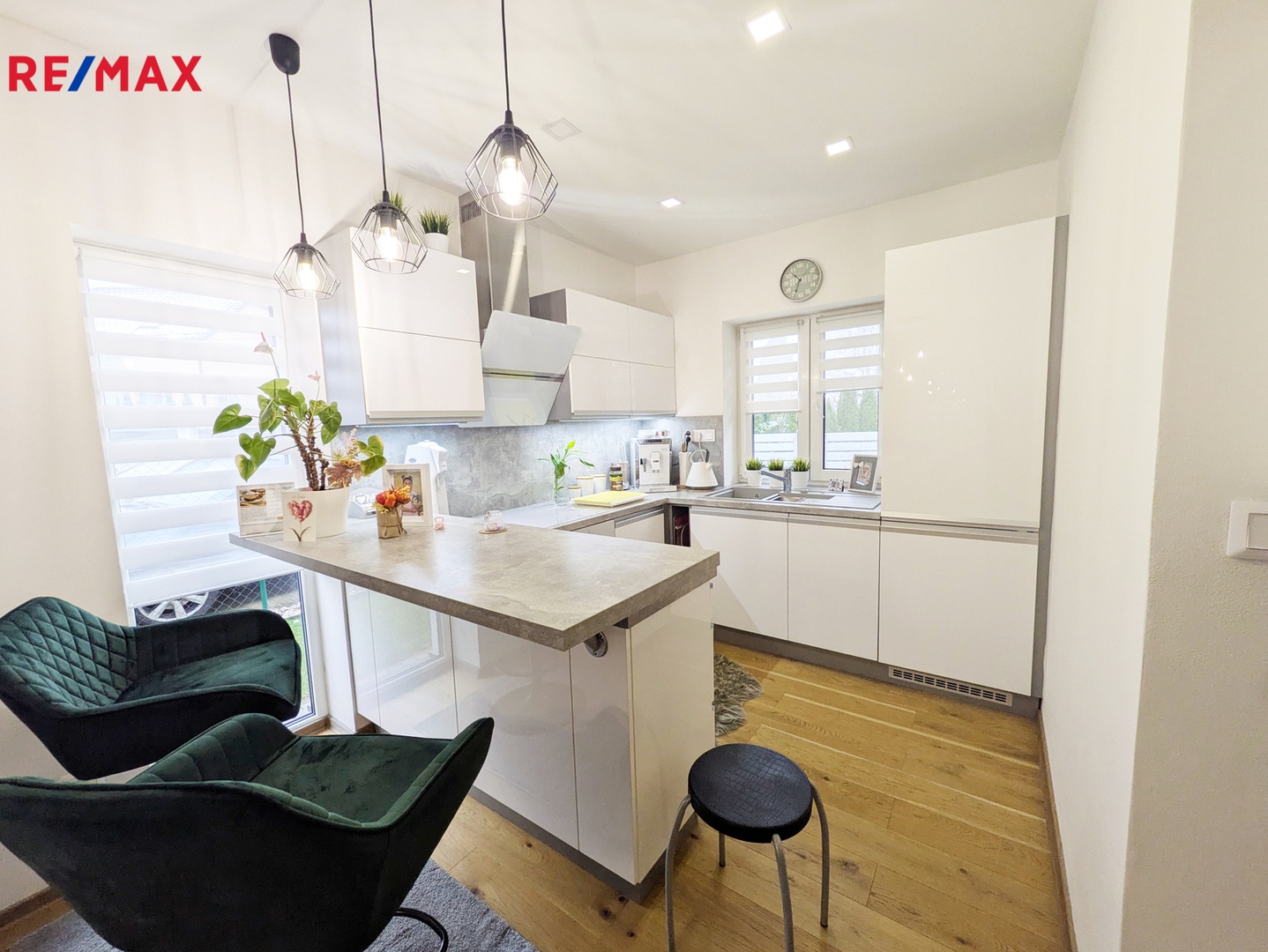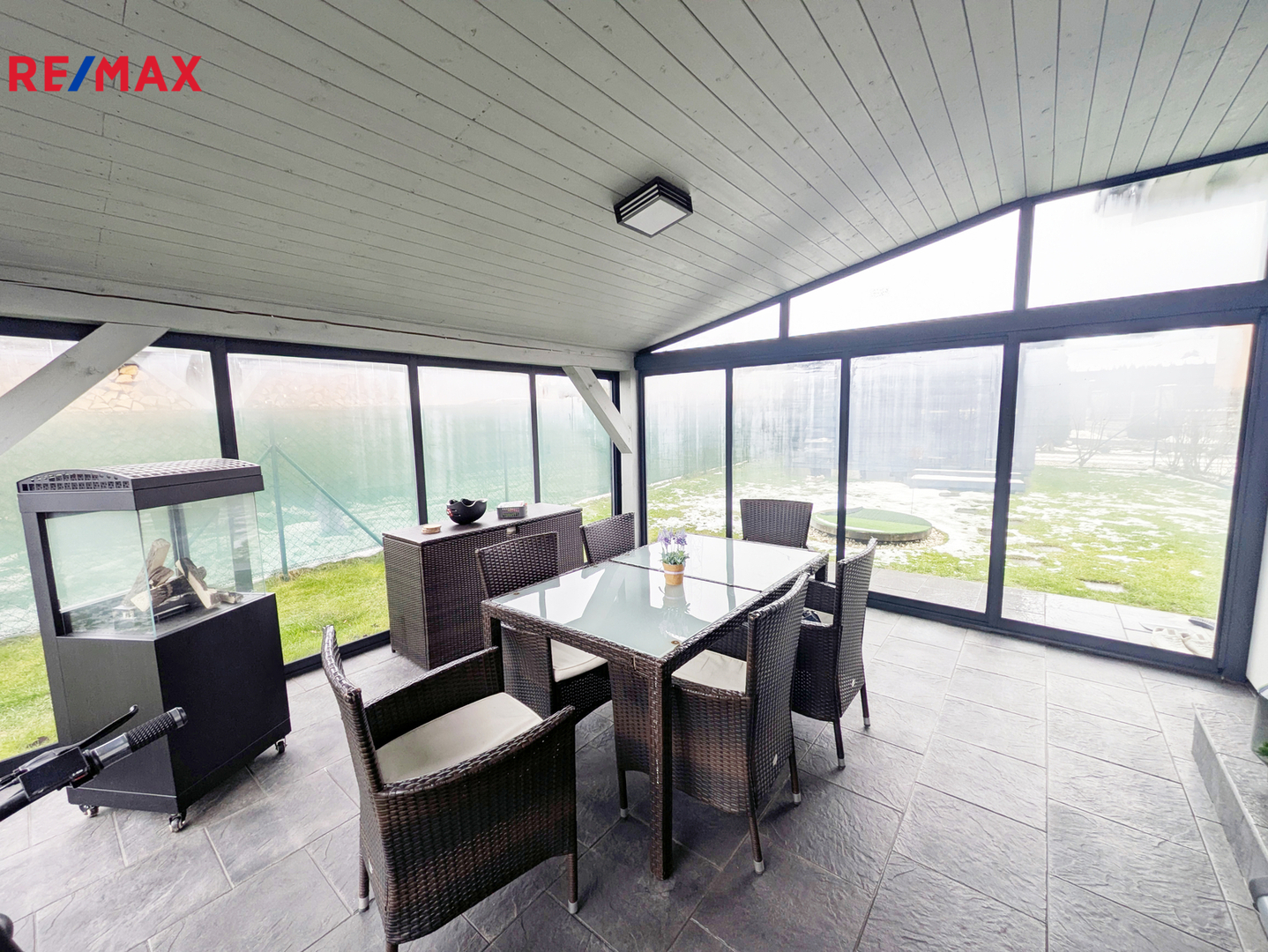 Dominantou domu je světlý obývací pokoj s kuchyňským koutem a přímým vstupem na terasu. Součástí kuchyně je nová kuchyňská linka vybavená základními spotřebiči včetně indukční varné desky, trouby a digestoře. Z obývací části je také vstup do prosklené verandy, která vede přímo na zahradu. Pozemek o výměře přibližně 300 m² je obdélníkového tvaru, kompletně oplocen a zatravněn. Na zahradě se nachází dřevěný přístřešek na nářadí. K domu náleží také vlastní parkovací stání pro dvě vozidla.