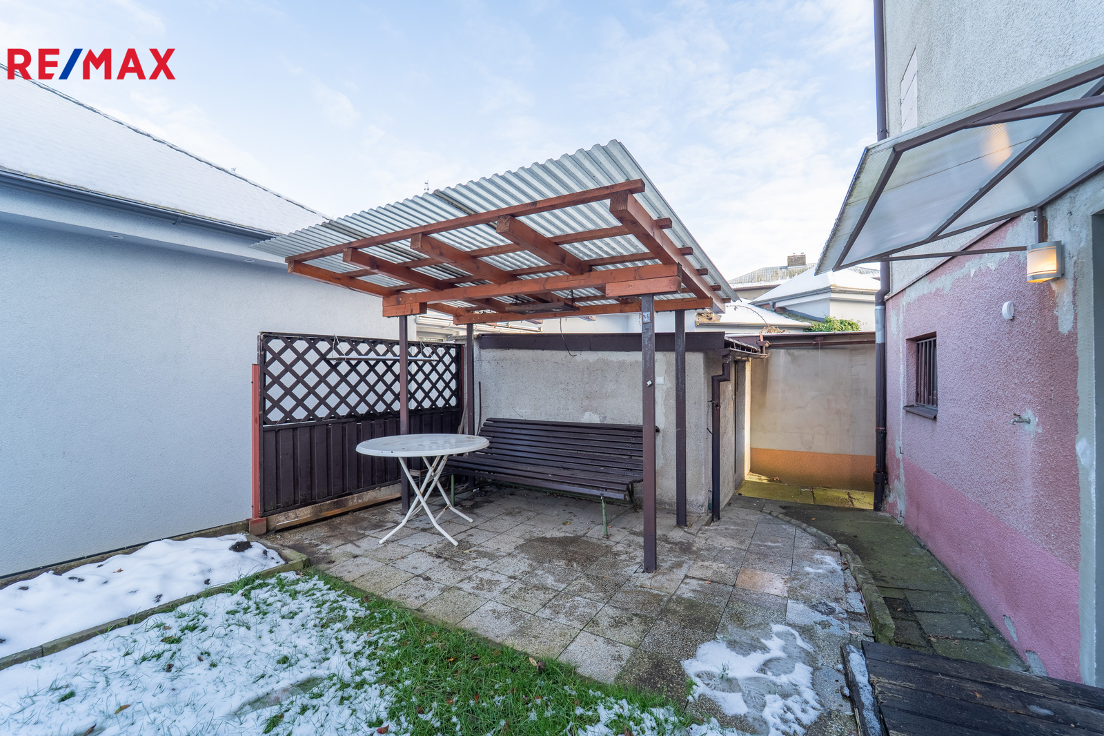Soukromý koutek s dřevěným přístřeškem je ideální pro posezení s rodinou, grilování i odpočinek po práci. Ocení ho každý, kdo miluje květiny a vlastní kus zeleně přímo u domu.