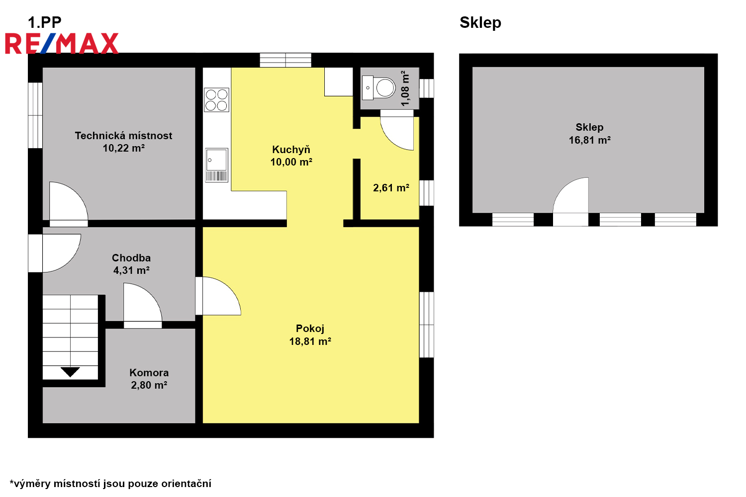 1. NP: kuchyň se spotřebiči, jídelna, obývací pokoj, WC, komora, technická místnost (plynový kotel), sklep s dílnou, vstup na zahradu.