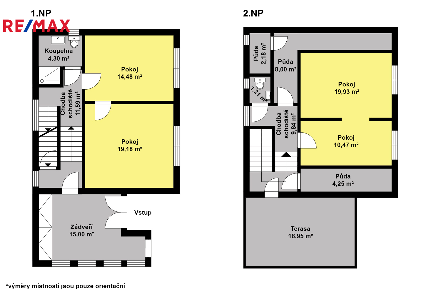 2. NP: dva pokoje a koupelna s WC, vstup z přední části domu přes prostornou chodbu.