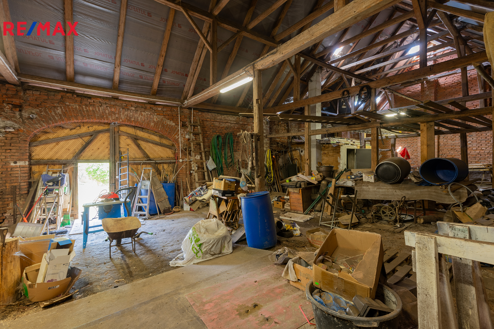 Hospodářská budova – samostatně stojící patrová stodola 178 m² - možnost přestavby na stylovou restauraci, svatební sál, ubytování nebo víceúčelovou rekreační část. Pod stodolou se nachází prostorný sklep – ideální pro uskladnění produktů z vlastní zahrady, vína nebo kulinářských zásob. Stodola díky své velikosti, dispozici a atmosféře nabízí výjimečný potenciál pro svatby, oslavy, workshopy nebo gastronomický provoz. Přilehlá garáž/dílna.