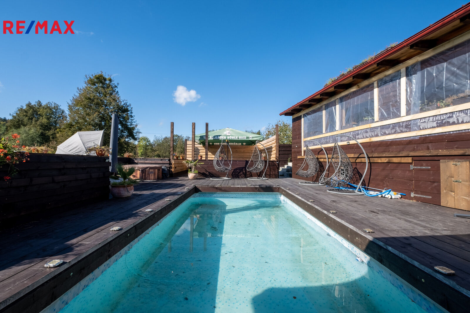 Velká prostorná zahrada s výhledy do zeleně, a velký plavecký bazén s terasou, vířivkou a posezením nabízí absolutní relax, klid a pohodu.