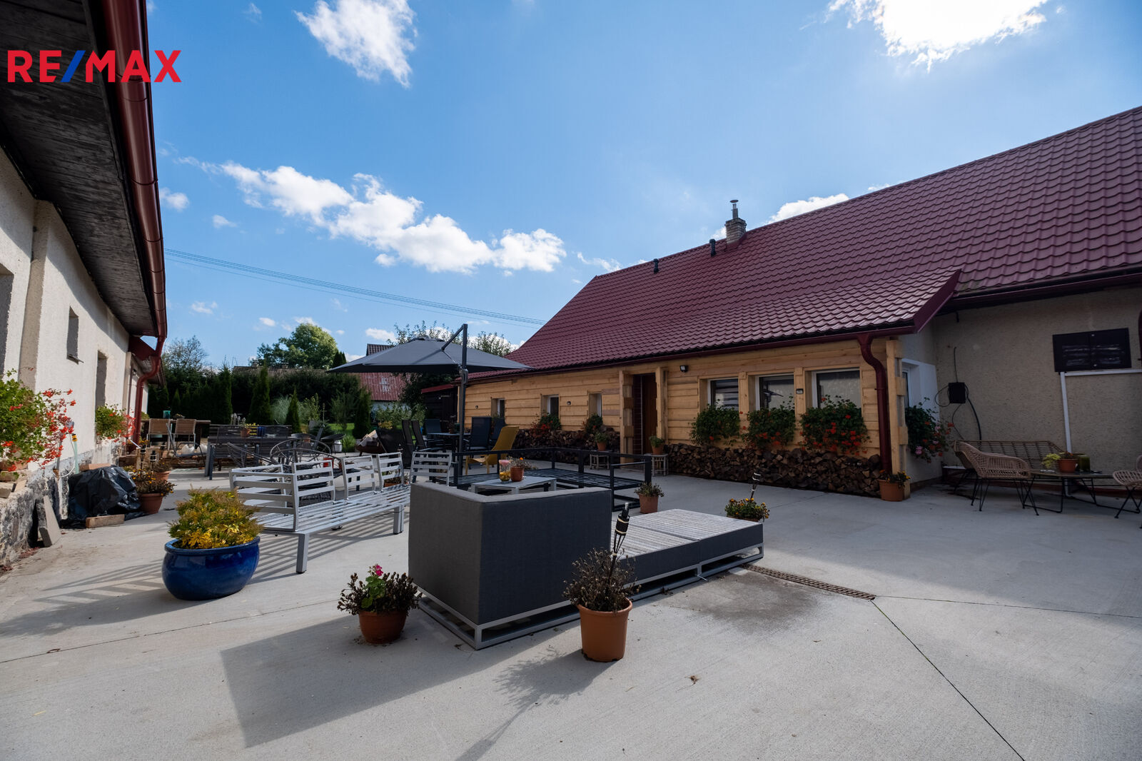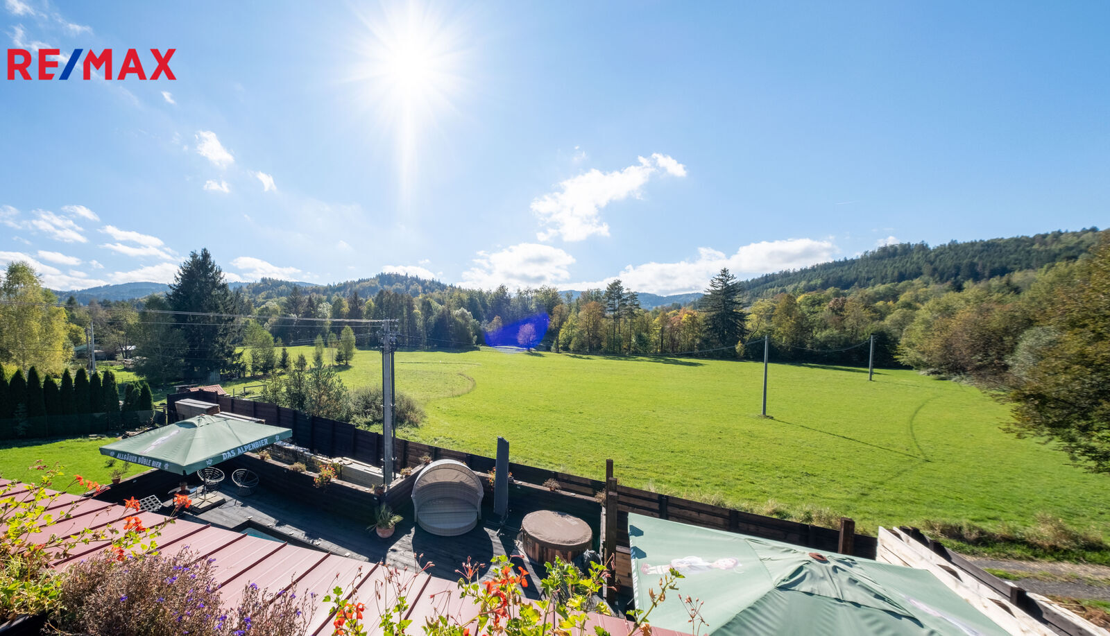 Velkou výhodou je prostorná terasa a výhledy do zeleně. která pojme až 40 lidí- ideální pro venkovní posezení, oslavy, nebo grilování s přáteli.
