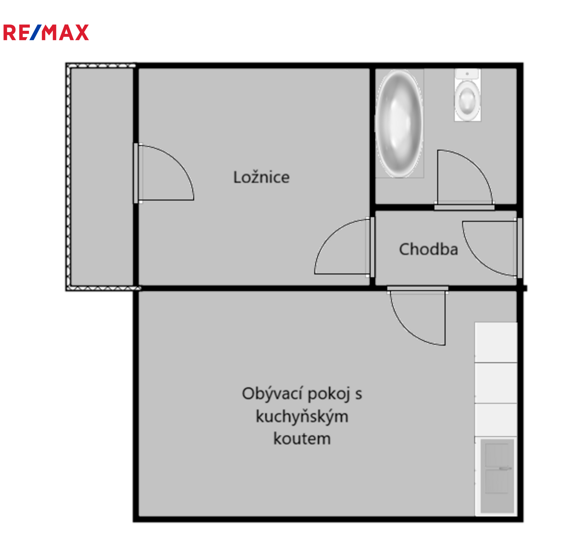 Dispozice bytu zahrnuje vstupní chodbu, ložnici se zasklenou lodžií, obývací pokoj s kuchyňským koutem a koupelnu s vanou. Byt je vhodný pro jednotlivce nebo pár, kteří hledají dlouhodobý pronájem.